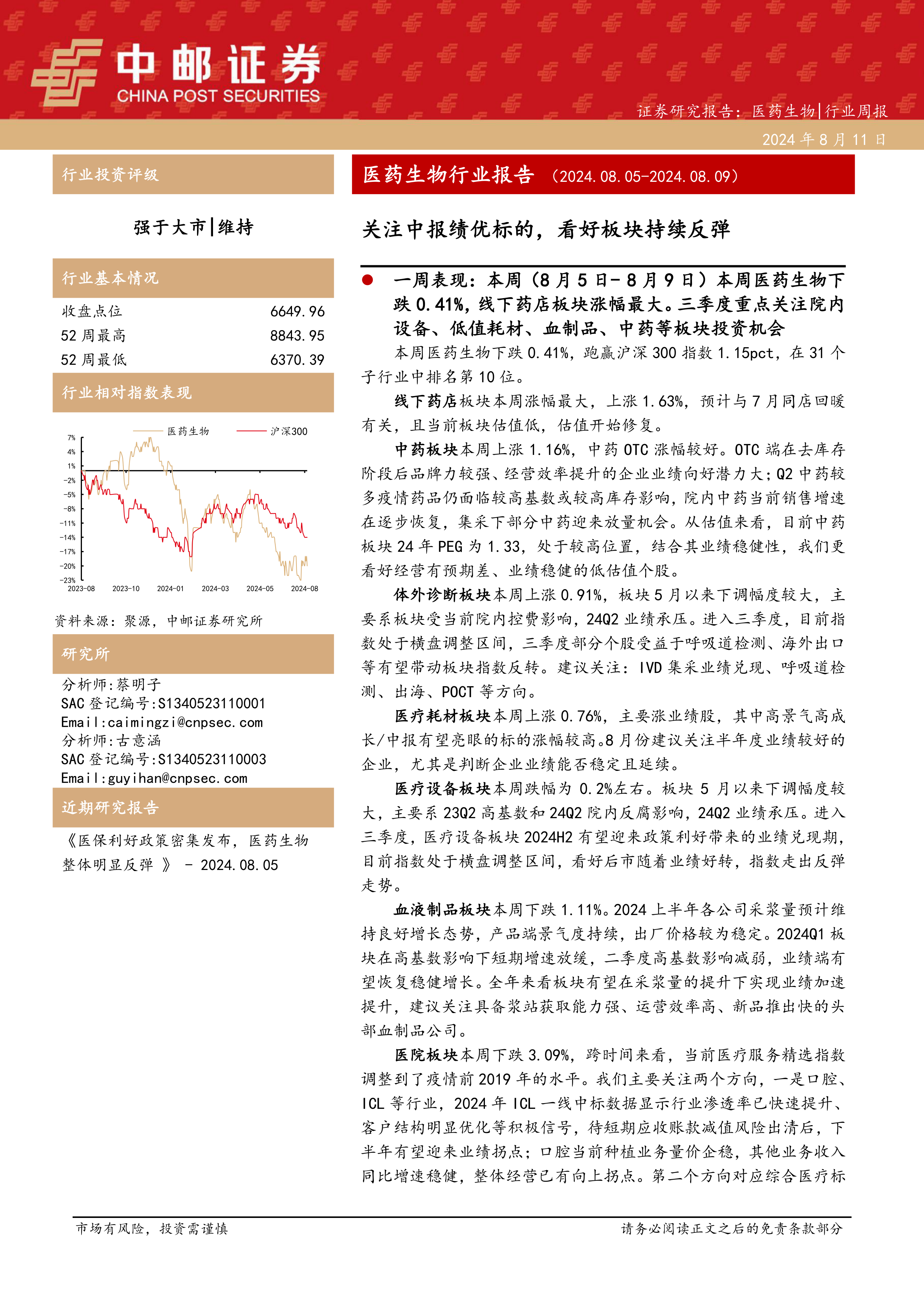 本报告对医药生物行业2024年8月5日至8月9日期间的市场表现进行了深入分析,并展望了三季度的投资机会。尽管本周行业整体小幅下跌,但其相对沪深300指数的优异表现以及部分子板块的强劲增长,预示着行业底部投资机会的到来。报告强调,投资者应重点关注中期业绩表现优异的标的,并把握由政策利好(如医疗设备“以旧换新”)和行业自身发展趋势(如CXO投融资回暖、药店同店回暖)驱动的结构性增长机会。