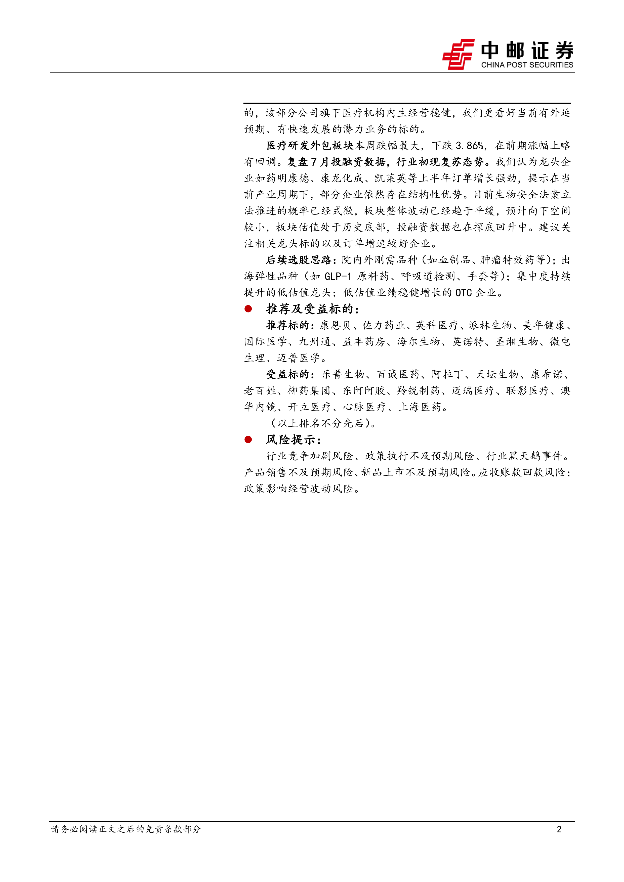 医疗研发外包板块本周跌幅最大,下跌3.86%,在前期涨幅上略有回调。复盘7月投融资数据,行业初现复苏态势。我们认为龙头企业如药明康德、康龙化成、凯莱英等上半年订单增长强劲,提示在当前产业周期下,部分企业依然存在结构性优势。目前生物安全法案立法推进的概率已经式微,板块整体波动已经趋于平缓,预计向下空间较小,板块估值处于历史底部,投融资数据也在探底回升中。建议关注相关龙头标的以及订单增速较好企业。