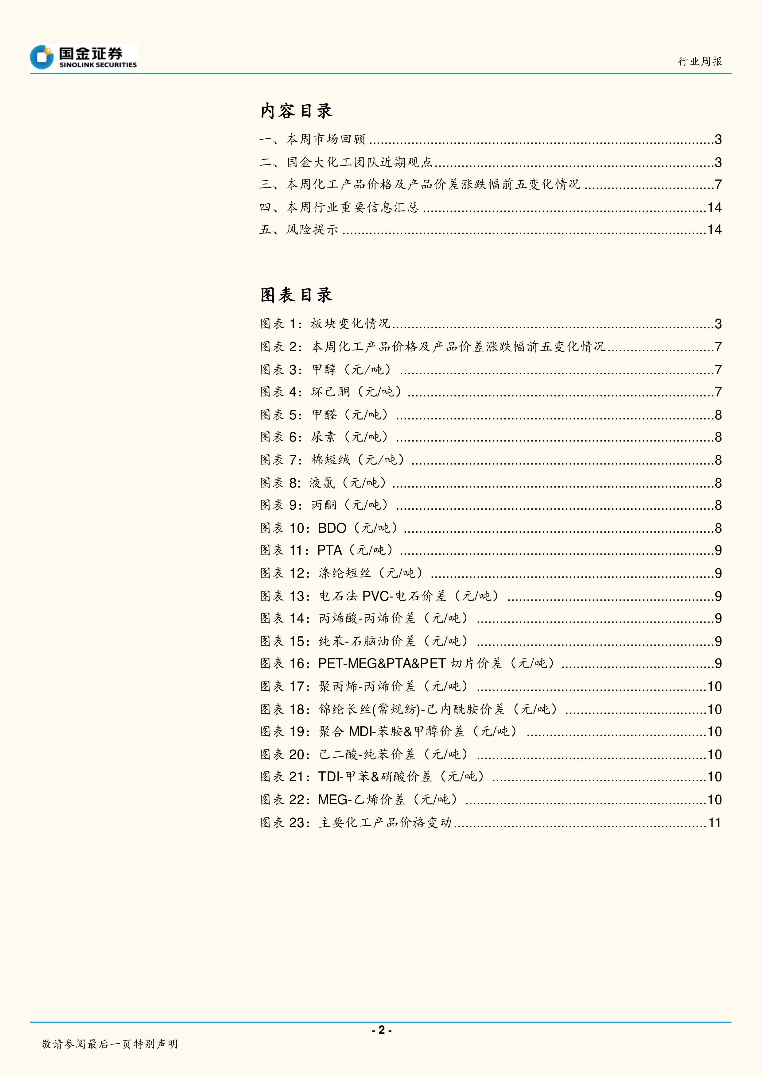本周化工板块下跌 1.36%,沪深 300 上涨 2.29%,化工板块跑输沪深 300。本周周期板块调整较为明显,部分产品价格高位风险提升,带动市场情绪波动较大。
