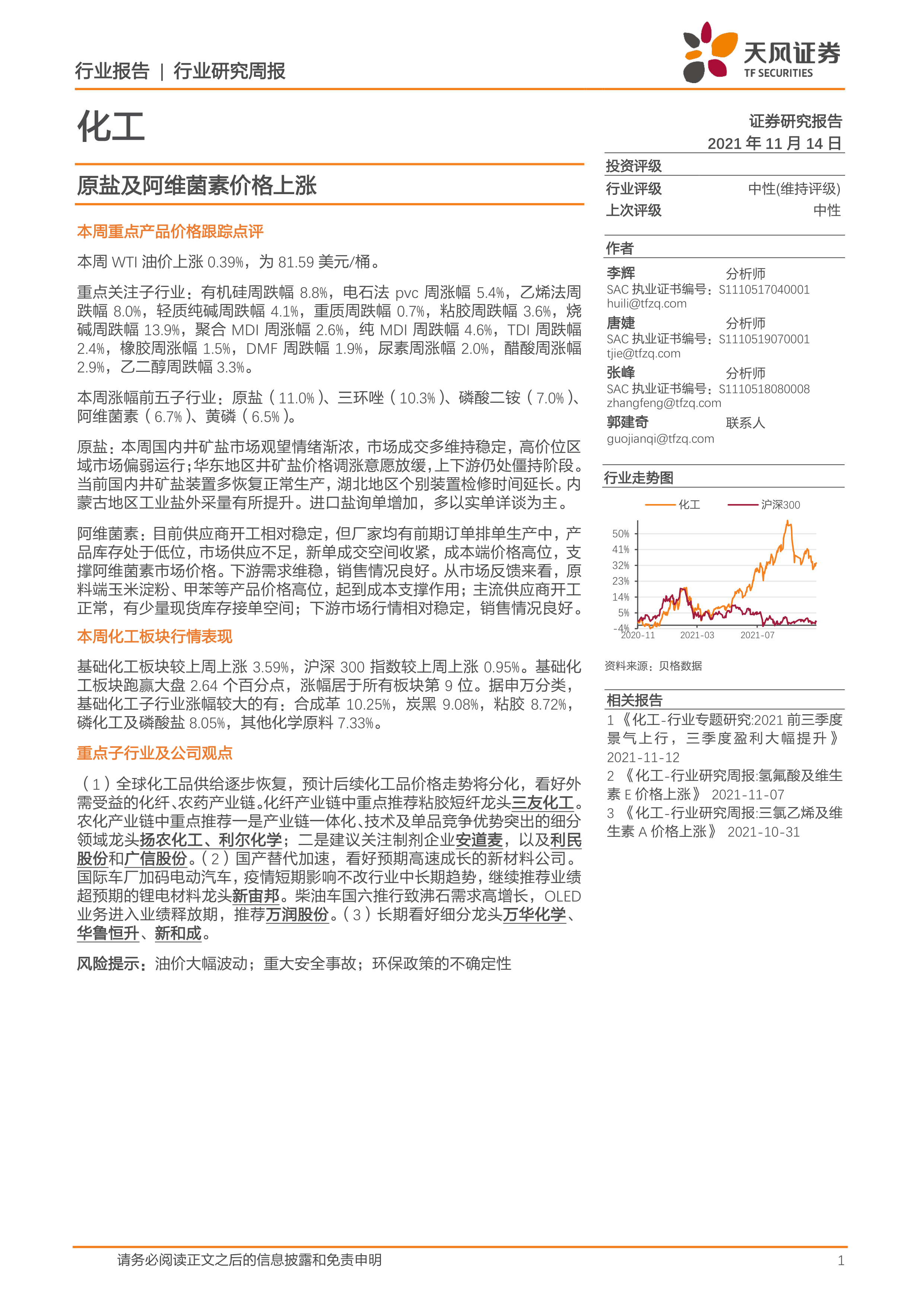 本报告分析了2021年11月14日当周化工行业的市场表现,重点关注了产品价格和价差的变动,并对重点子行业和公司进行了观点更新。