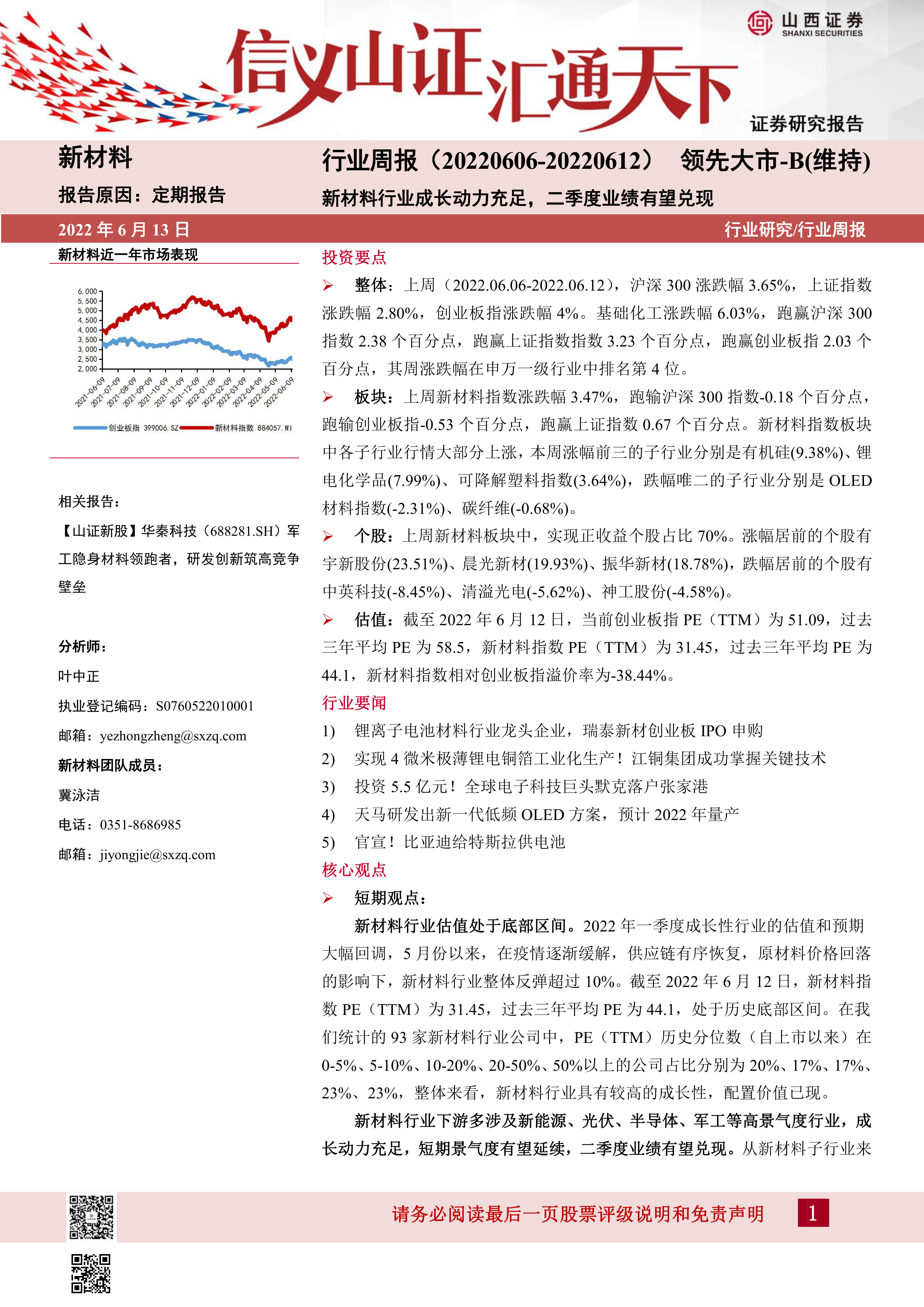 新材料行业在2022年6月6日至6月12日期间展现出强劲的成长动力和投资价值。尽管新材料指数短期内略跑输主要大盘指数,但基础化工行业整体表现优异,且新材料板块内部如有机硅、锂电化学品等子