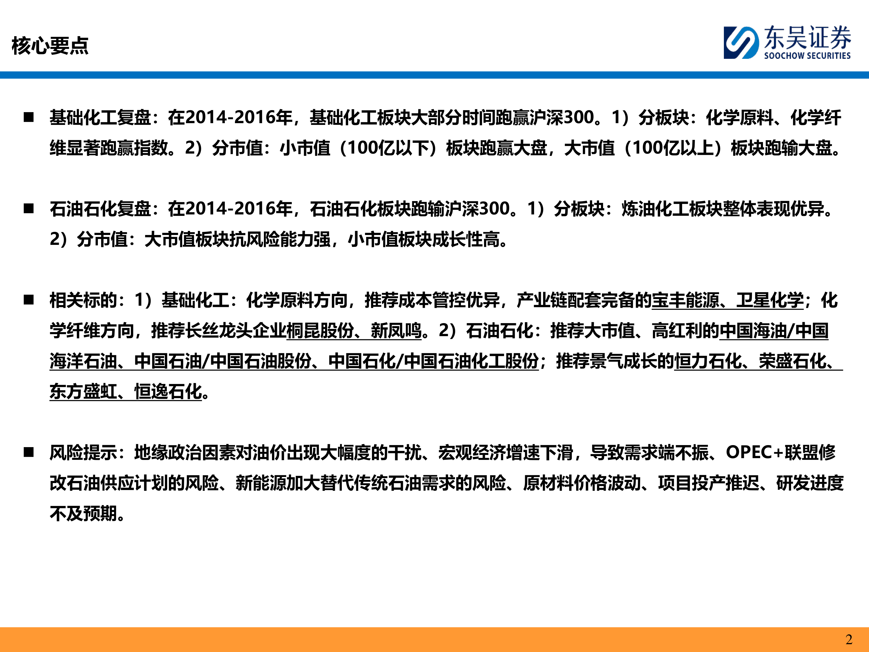 本报告对2014-2016年基础化工与石油石化两大板块的市场表现进行了全面复盘与深入分析。研究发现,基础化工板块整体表现优于沪深300指数,尤其在化学原料和化学纤维等细分领域展现出显著的超额收益,且小市值公司表现活跃。相比之下,石油石化板块整体跑输沪深300指数,但炼油化工板块表现稳健,大市值公司抗风险能力较强。报告基于这些分析,推荐了宝丰能源、卫星化学、桐昆股份、新凤鸣等基础化工领域的优质标的,以及中国海油、中国石油、中国石化等石油石化领域的大市值、高红利标的,同时强调了恒力石化、荣盛石化、东方盛虹、恒逸石化等景气成长型企业。投资者在把握投资机会的同时,需警惕地缘政治、宏观经济、OPEC+政策、新能源替代、原材料价格波动、项目投产及研发进度等潜在风险。