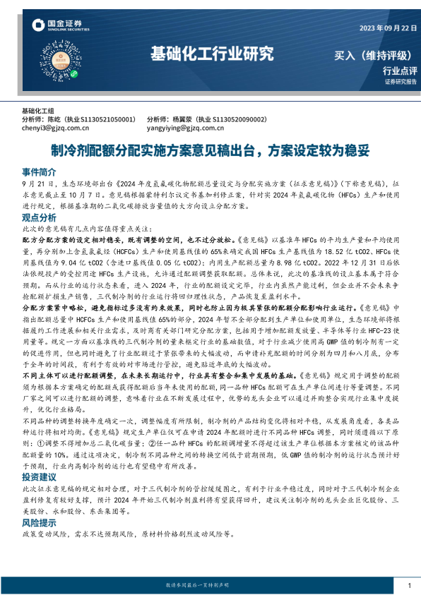 基础化工行业:制冷剂配额分配实施方案意见稿出台,方案设定较为稳妥