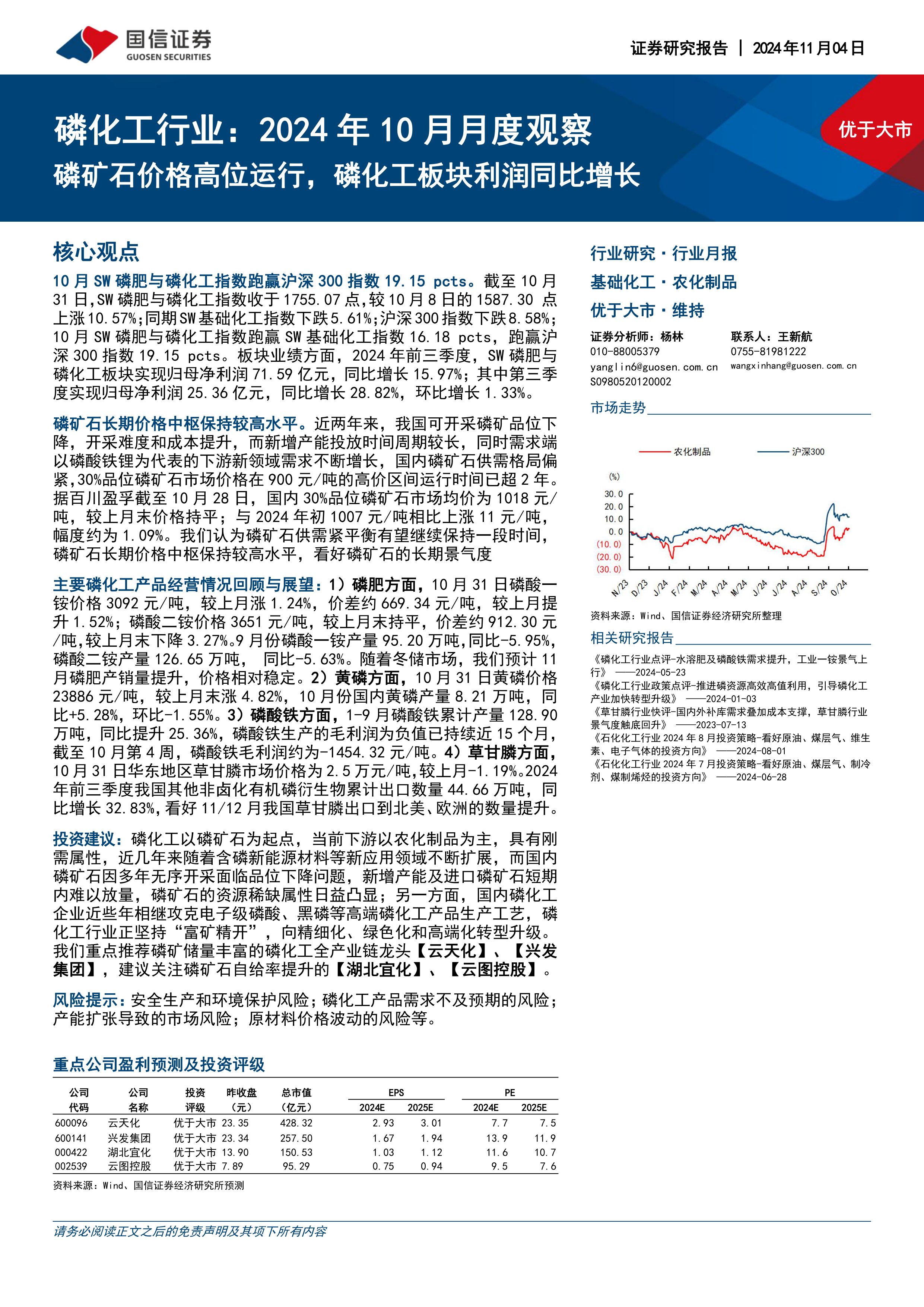 磷化工行业:2024年10月月度观察:磷矿石价格高位运行,磷化工板块利润同比增长