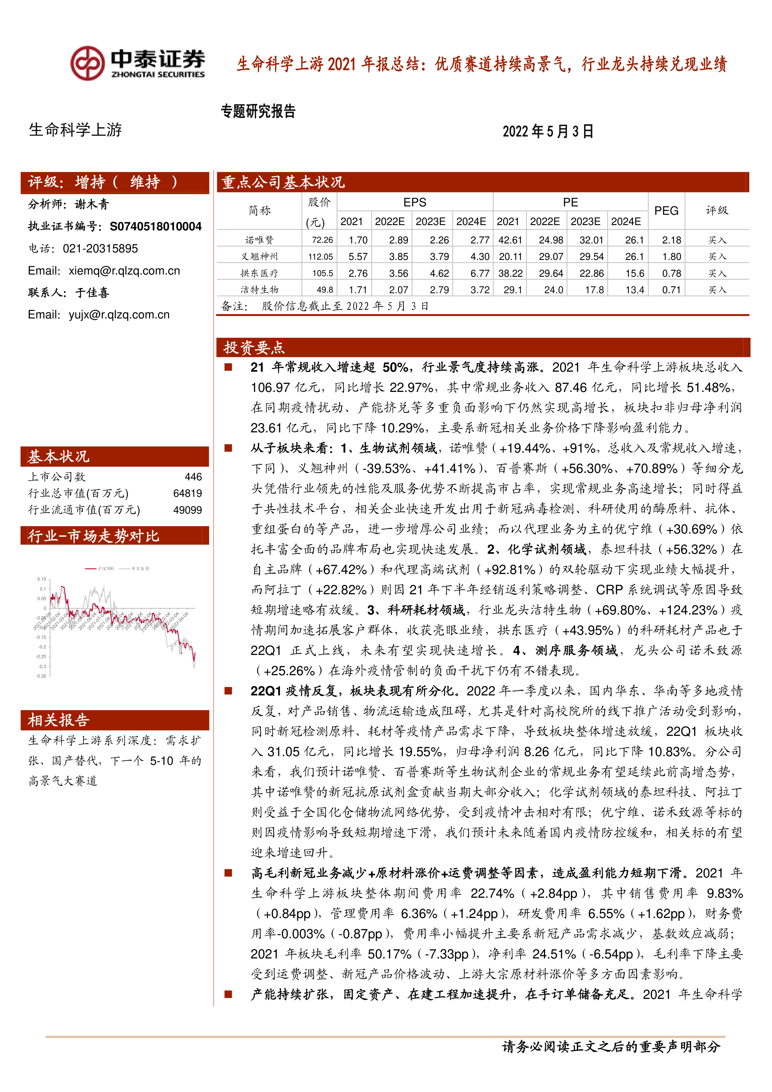 本报告总结了2021年生命科学上游行业的发展情况,并分析了2022年一季度的表现,揭示了该行业的核心观点: