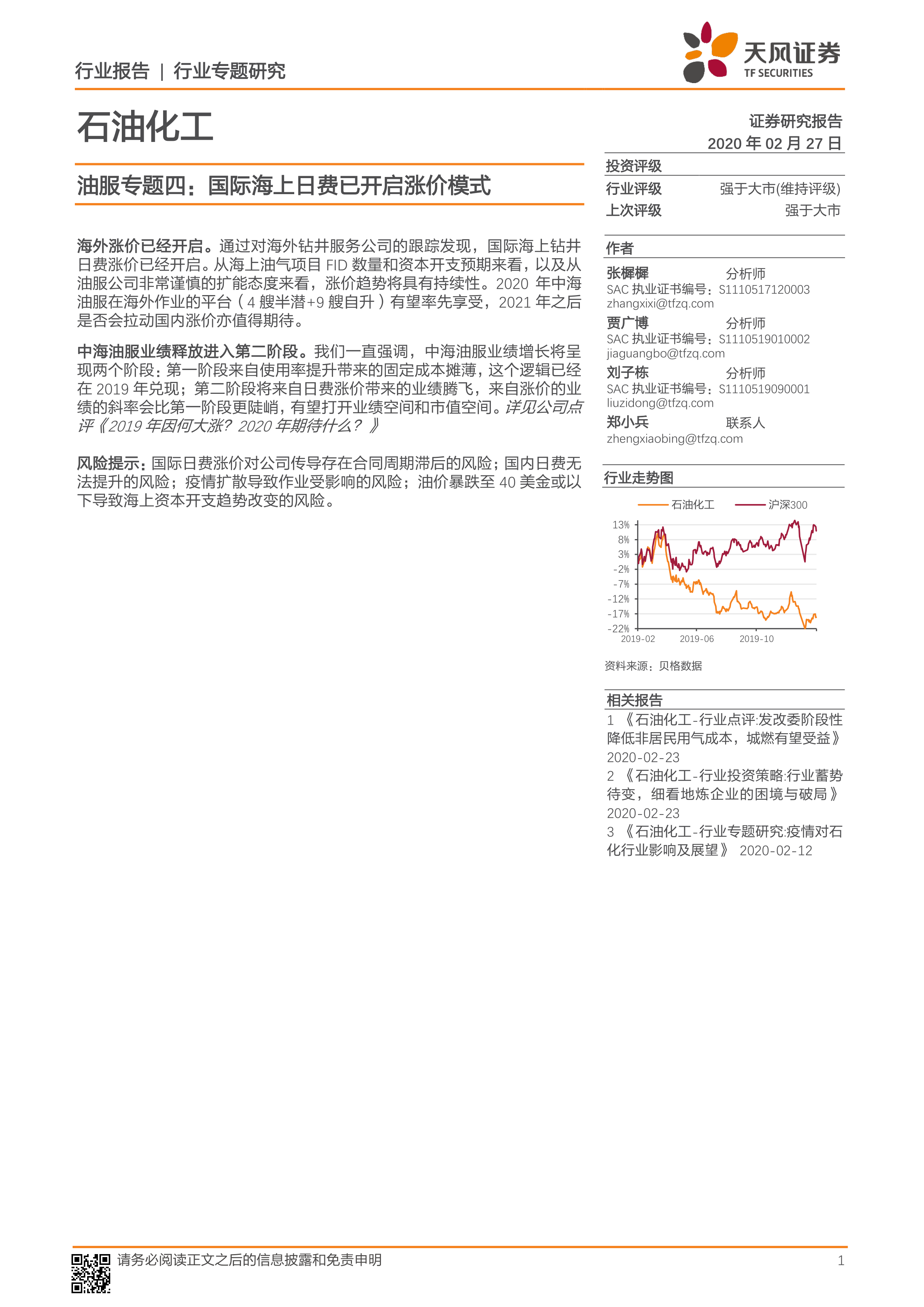 本报告分析了国际海上钻井日费的涨价趋势,认为海外市场已经开启涨价模式,主要受益于海上油气项目FID数量增加和资本开支预期上升,以及油服公司谨慎的扩能态度。中海油服有望率先受益于此次涨价,预计2020年海外涨价将给公司业绩带来约4.5亿净利润增厚。维持中海油服2019/2020/2021年业绩预测25/38/47亿,并认为2021年之后业绩预测有上调的可能性。