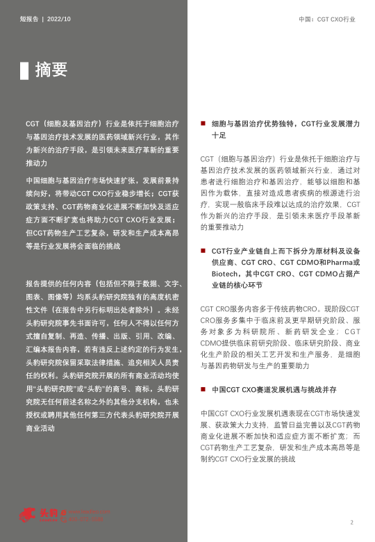 CGT(细胞及基因治疗)行业是依托于细胞治疗与基因治疗技术发展的医药领域新兴行业,其作为新兴的治疗手段,是引领未来医疗革新的重要推动力