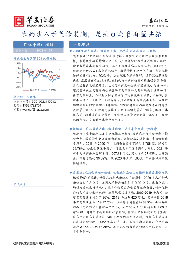 本报告核心观点指出,2023年农药行业有望迎来供需再平衡,景气度将出现明显修复,尤其是龙头企业有望实现α与β共振。随着落后产能加速出清、供给端格局持续优化,以及粮食安全问题对农药需求的刚性支撑,农药产品将保持较好的盈利能力。成本端压力逐步缓解,需求端有望延续增长,共同推动行业回暖。