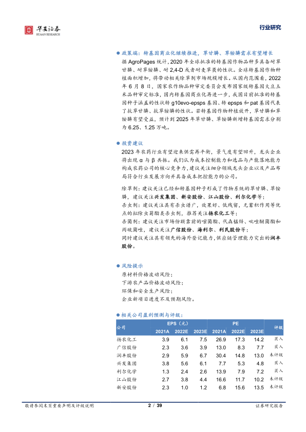 随着农药行业落后产能加速出清以及粮食安全问题对农药需求的提振,农药供需格局持续优化,农药产品保持较好的盈利能力。同时,由于农药需求具有周期性,上半年往往是农药需求旺季,我们预计,随着逐步进入Q1农药需求旺季,农药价格下降空间有限,有望维持较好的盈利能力。2023年,成本端压力逐步缓解,供给端格局继续优化,需求端有望延续增长,我们认为农药行业有望迎来供需再平衡,景气度将出现明显修复,尤其是农药龙头企业有望实现α与β共振。建议重点关注具有结构性机会的农药单品和具有明确成长性的公司,在农药品种上,与转基因种子形成了作物系统的草甘膦、草铵膦,具有杀虫谱广、效果好、低残留等优点的拟除虫菊酯类杀虫剂,以及市场份额靠前的嘧菌酯、代森锰锌、吡唑醚菌酯和丙硫菌唑等品种有望实现景气回升。同时国内农药龙头企业继续完善产业链条,加强一体化布局,提升海外登记能力,强化供应链管理能力等,都将进一步增强国内农药企业的全球竞争力水平。