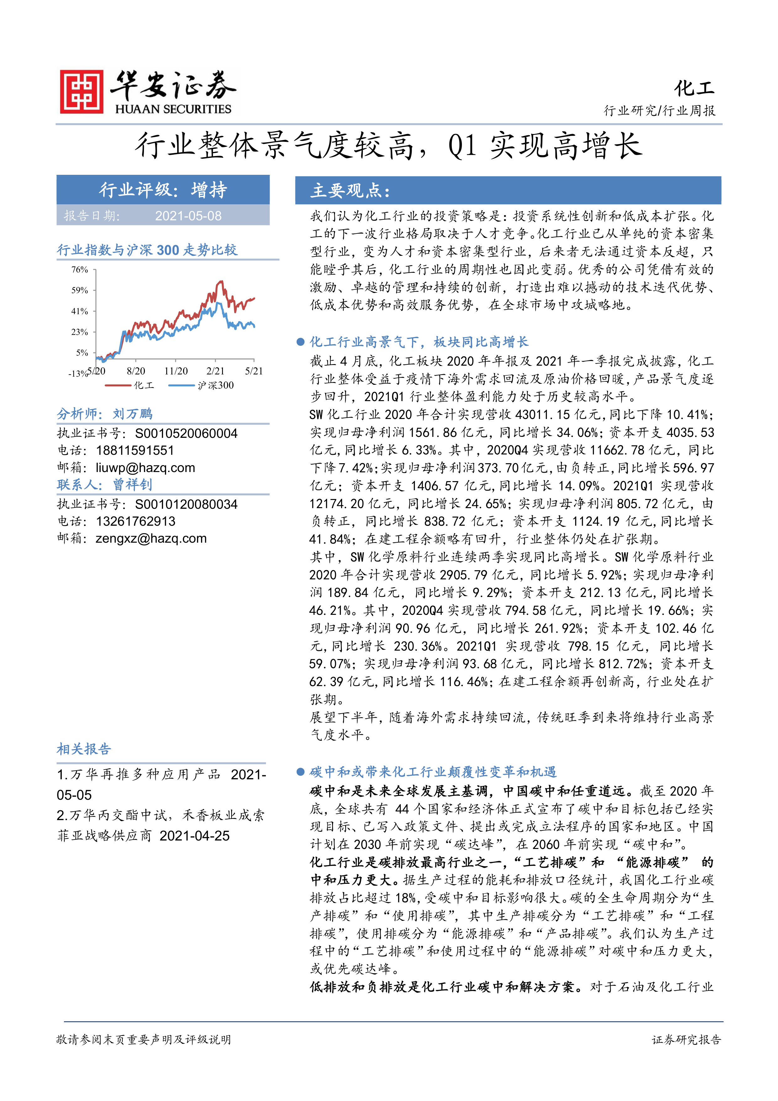 2021年第一季度,中国化工行业整体景气度显著提升,受益于海外需求回流和原油价格回暖,盈利能力达到历史较高水平。特别是SW化学原料行业,连续两季实现同比高增长。同时,"碳中和"目标为化工行业带来了颠覆性变革与发展机遇,促使行业向低排放、负排放技术转型,并加速生物基材料和循环材料的研发与应用。