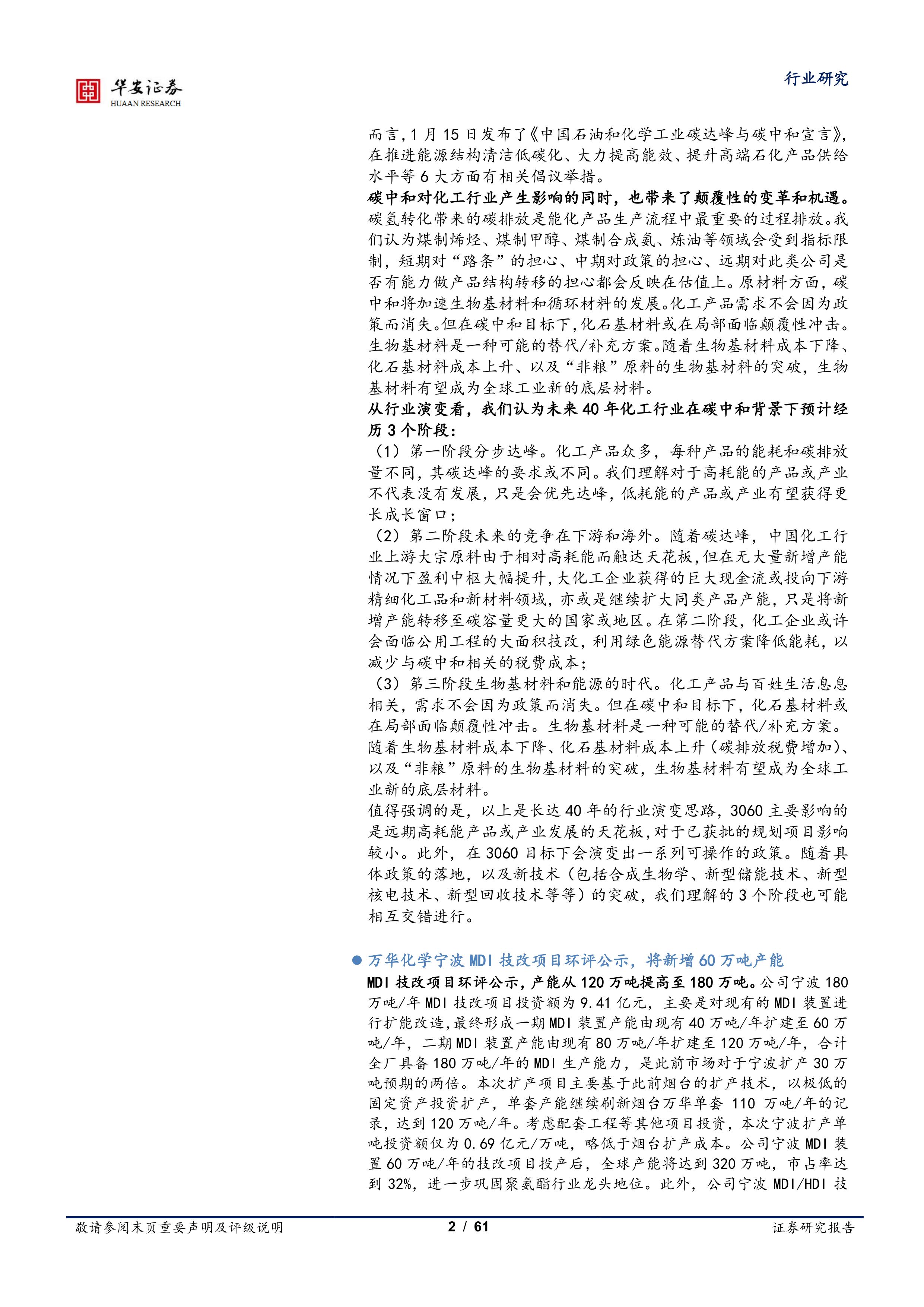 MDI 技改项目环评公示,产能从 120 万吨提高至 180 万吨。 公司宁波 180万吨/年 MDI 技改项目投资额为 9.41 亿元,主要是对现有的 MDI 装置进行扩能改造,最终形成一期 MDI 装置产能由现有 40 万吨/年扩建至 60 万吨/年,二期 MDI 装置产能由现有 80 万吨/年扩建至 120 万吨/年,合计全厂具备 180 万吨/年的 MDI 生产能力,是此前市场对于宁波扩产 30 万吨预期的两倍。本次扩产项目主要基于此前烟台的扩产技术,以极低的固定资产投资扩产,单套产能继续刷新烟台万华单套 110 万吨/年的记录,达到 120 万吨/年。考虑配套工程等其他项目投资,本次宁波扩产单吨投资额仅为 0.69 亿元/万吨,略低于烟台扩产成本。公司宁波 MDI 装置 60 万吨/年的技改项目投产后,全球产能将达到 320 万吨,市占率达到 32%,进一步巩固聚氨酯行业龙头地位。此外,公司宁波 MDI/HDI 技改扩能一体化项目总投资为 32.21 亿元,建设内容包括新建 28 万吨/年改性 MDI 装置、 5 万吨/年 HDI 单体装置、 6 万吨/年 HDI 加合物装置、12+24 万吨/年氯化氢氧化装置、 24 万吨/年甲醛装置、对造气装置配套改造以及相关辅助配套工程。项目全部投产后,宁波万华全厂将具备 30万吨/年改性 MDI、 10 万吨/年的 HDI 单体、 58 万吨/年的氯化氢氧化的生产能力,冷箱能力也将由 12000Nm3/h 提升至 18000Nm3/h。改性 MDI和 HDI 的投产也将提升万华产品附加值。