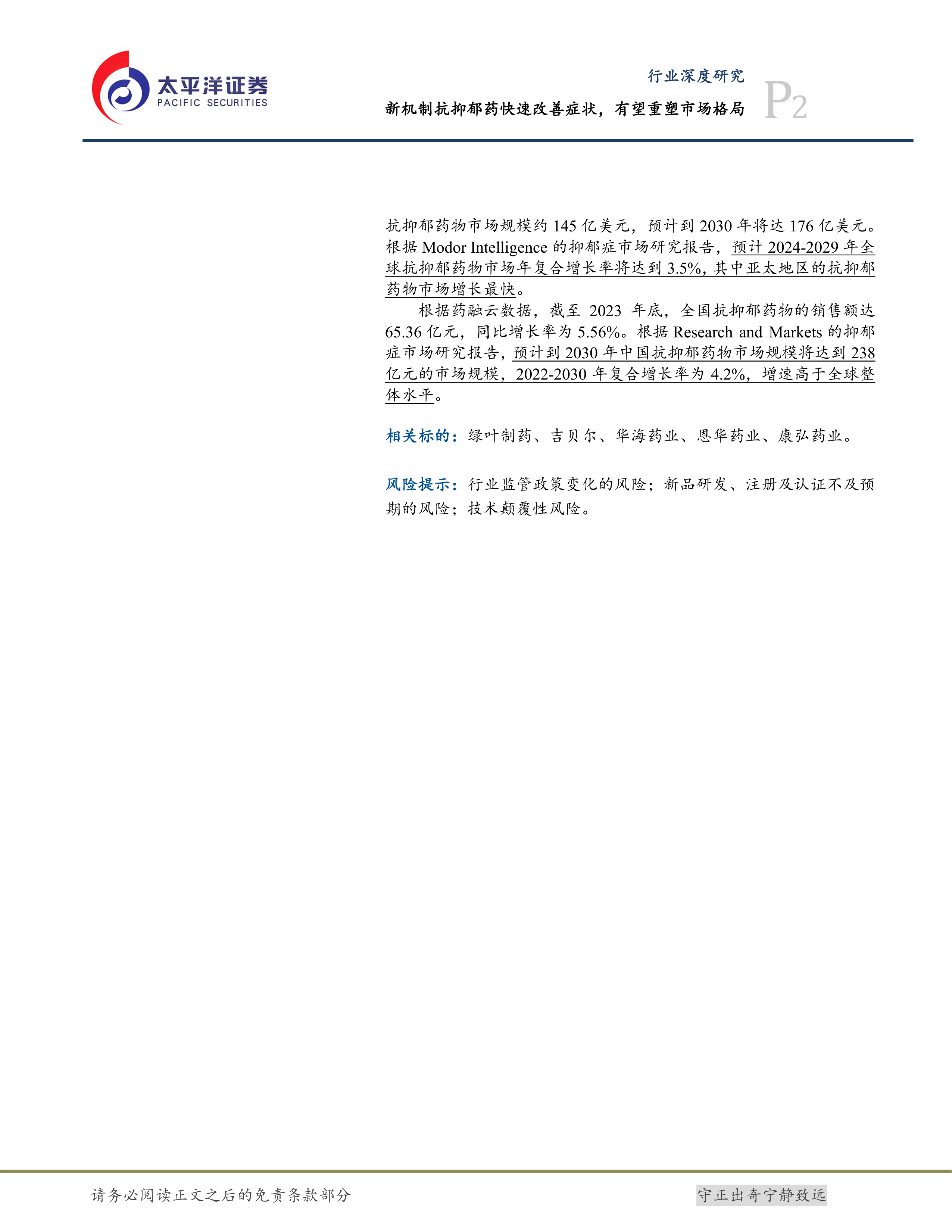 根据Research and Markets的抑郁症市场研究报告,2022年全球抗抑郁药物市场规模约145亿美元,预计到2030年将达176亿美元。根据Modor Intelligence的抑郁症市场研究报告,预计2024-2029年全球抗抑郁药物市场年复合增长率将达到3.5%,其中亚太地区的抗抑郁药物市场增长最快。
