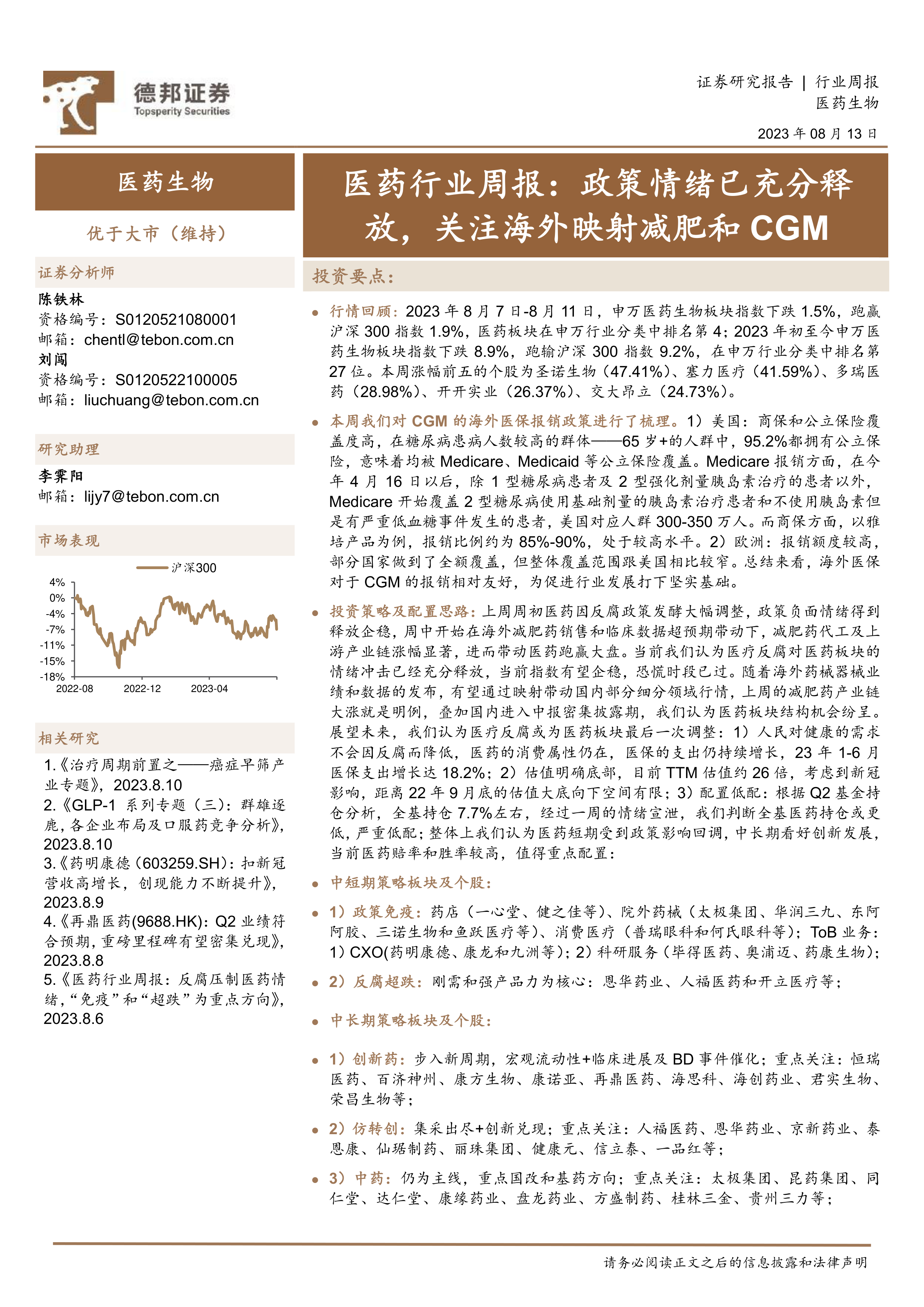 投资策略及配置思路:上周周初医药因反腐政策发酵大幅调整,政策负面情绪得到释放企稳,周中开始在海外减肥药销售和临床数据超预期带动下,减肥药代工及上游产业链涨幅显著,进而带动医药跑赢大盘。当前我们认为医疗反腐对医药板块的情绪冲击已经充分释放,当前指数有望企稳,恐慌时段已过。随着海外药械器械业绩和数据的发布,有望通过映射带动国内部分细分领域行情,上周的减肥药产业链大涨就是明例,叠加国内进入中报密集披露期,我们认为医药板块结构机会纷呈。展望未来,我们认为医疗反腐或为医药板块最后一次调整:1)人民对健康的需求不会因反腐而降低,医药的消费属性仍在,医保的支出仍持续增长,23年1-6月医保支出增长达18.2%;2)估值明确底部,目前TTM估值约26倍,考虑到新冠影响,距离22年9月底的估值大底向下空间有限;3)配置低配:根据Q2基金持仓分析,全基持仓7.7%左右,经过一周的情绪宣泄,我们判断全基医药持仓或更低,严重低配;整体上我们认为医药短期受到政策影响回调,中长期看好创新发展,当前医药赔率和胜率较高,值得重点配置: