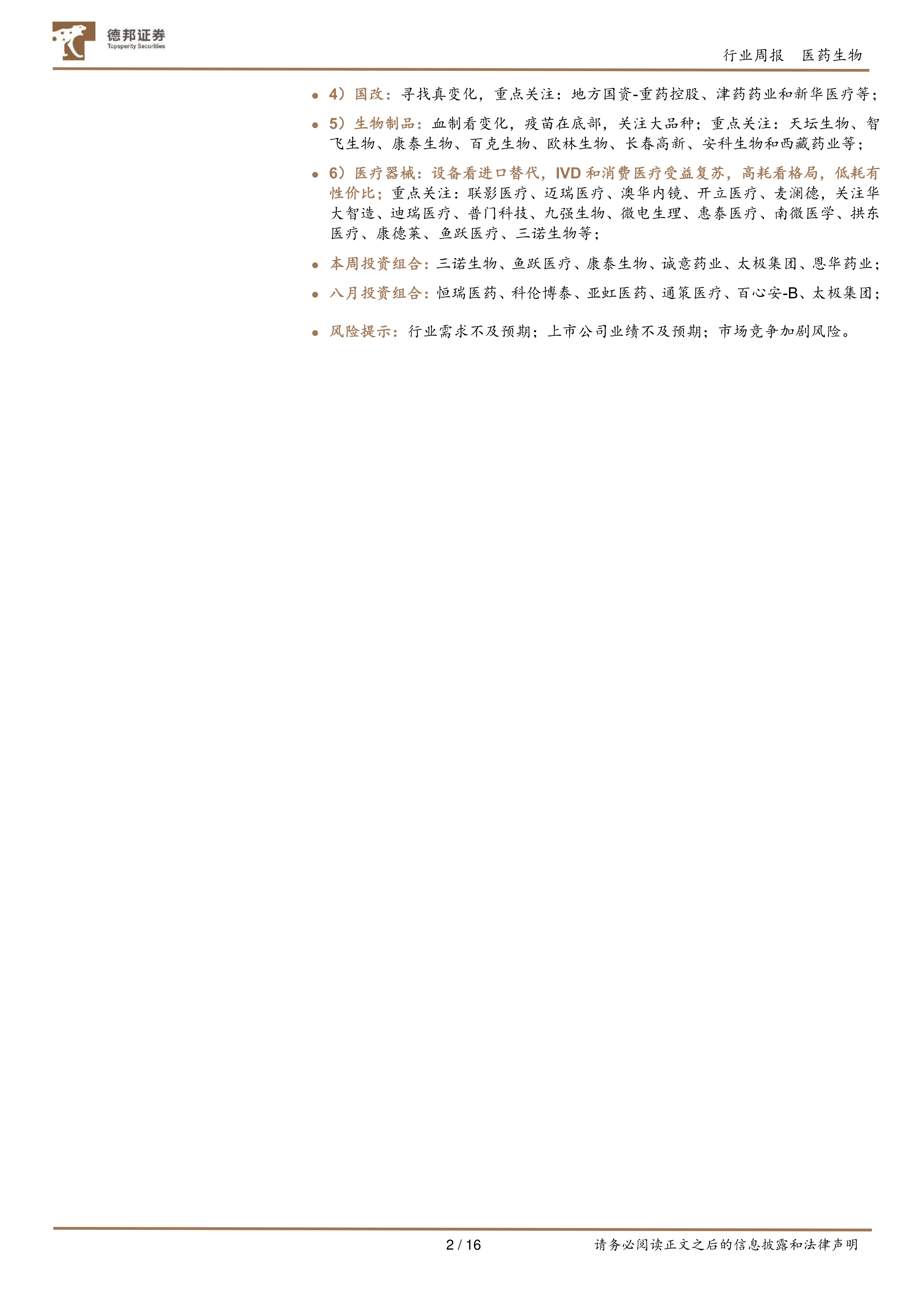 3)中药:仍为主线,重点国改和基药方向;重点关注:太极集团、昆药集团、同仁堂、达仁堂、康缘药业、盘龙药业、方盛制药、桂林三金、贵州三力等;