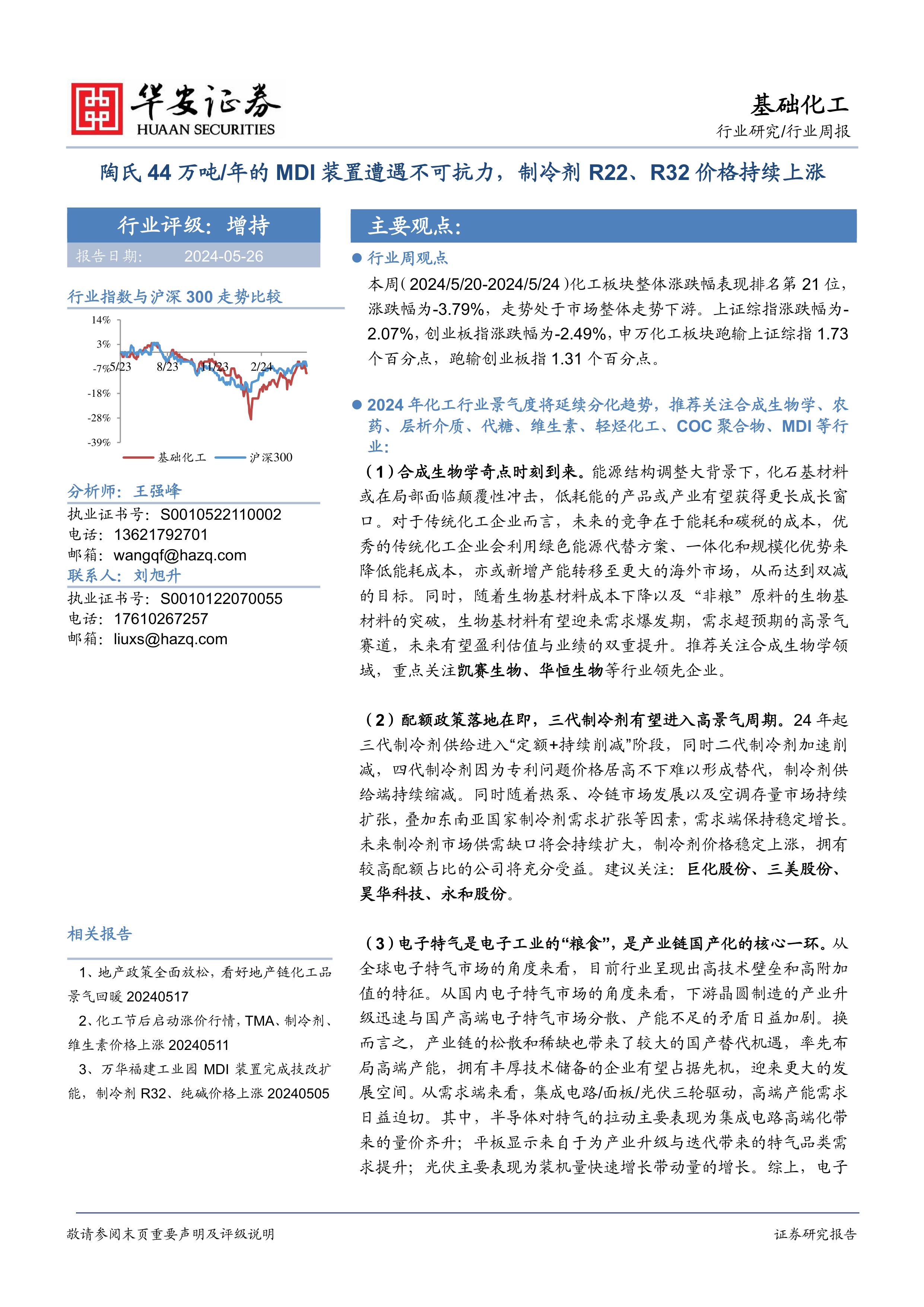 基础化工行业周报:陶氏44万吨/年的MDI装置遭遇不可抗力,制冷剂R22、R32价格持续上涨