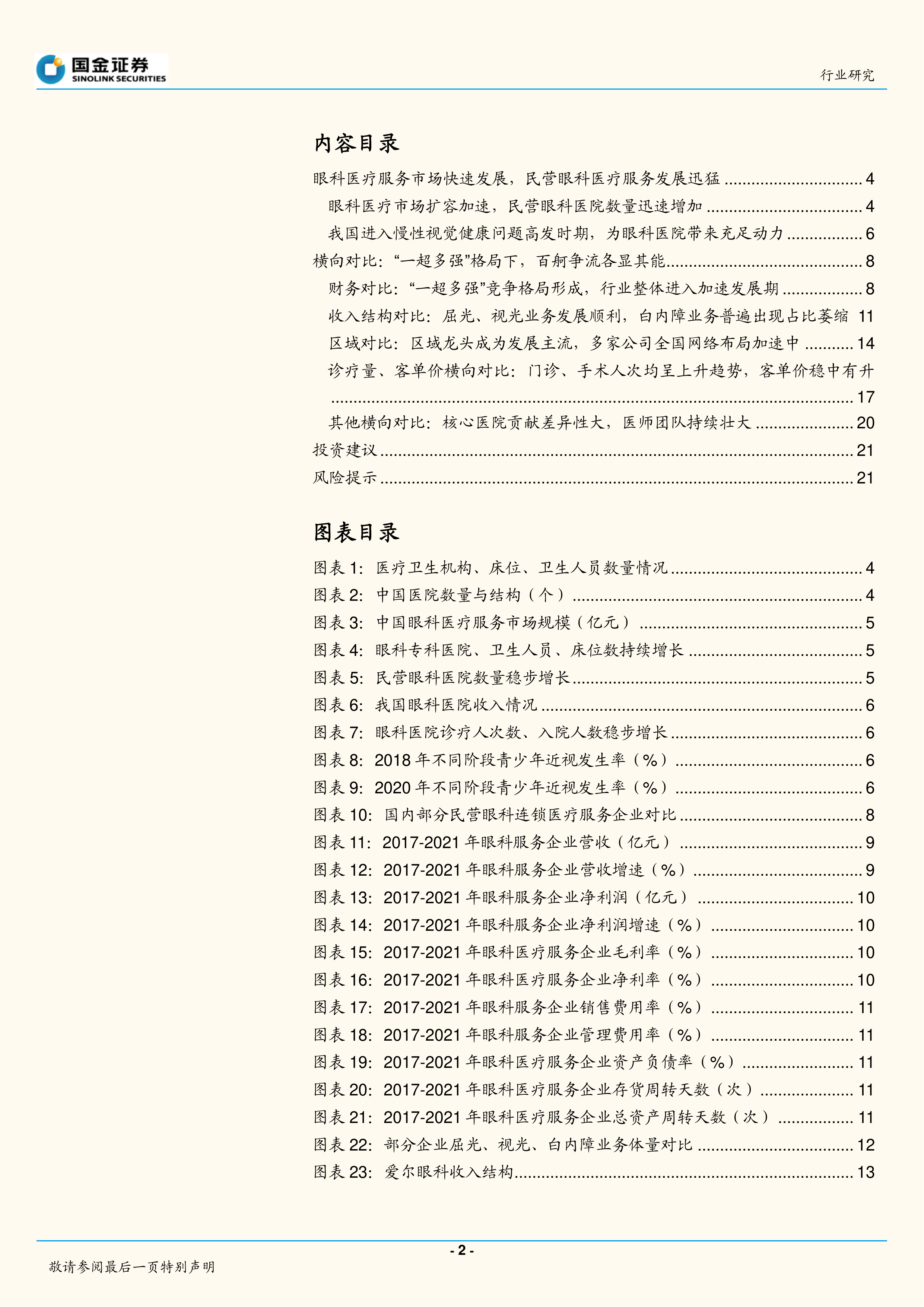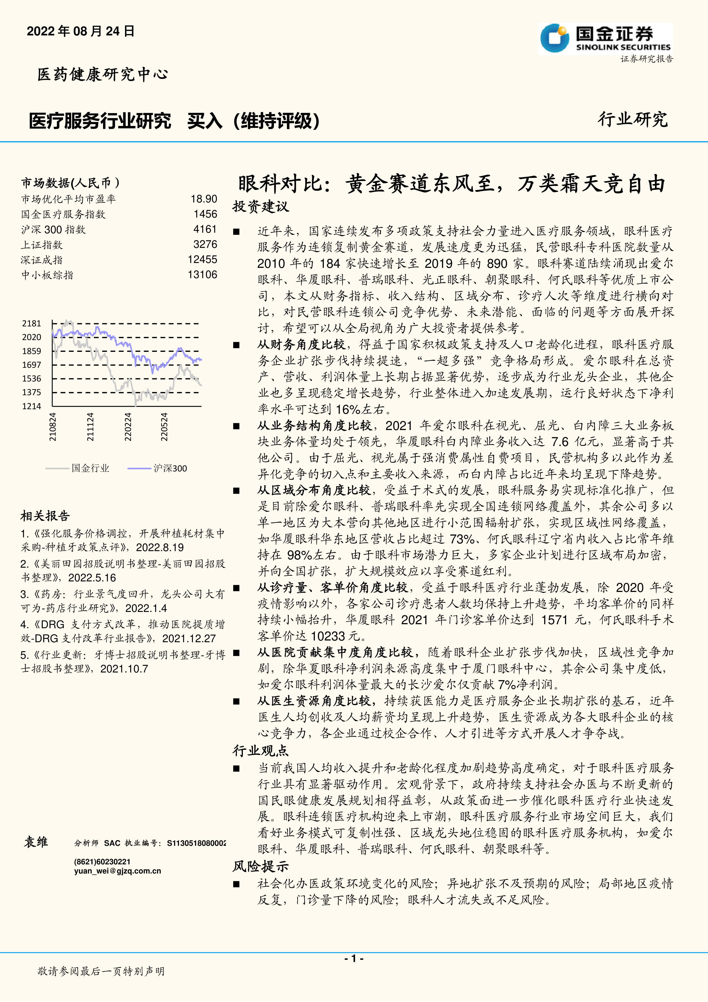 眼科服务行业不易受牌照壁垒束缚,资金需求适中,且受益于技术和器械发展,业务可复制性极强。公立医院在部分领域并无明显优势,为民营机构提供了广阔的差异化竞争空间。因此,我们看好业务模式可复制性强、区域龙头地位稳固的眼科医疗服务机构的未来发展潜力。然而,投资者仍需关注社会化办医政策环境变化、医保政策调整、异地扩张不及预期、局部疫情反复以及眼科人才流失或不足等潜在风险。