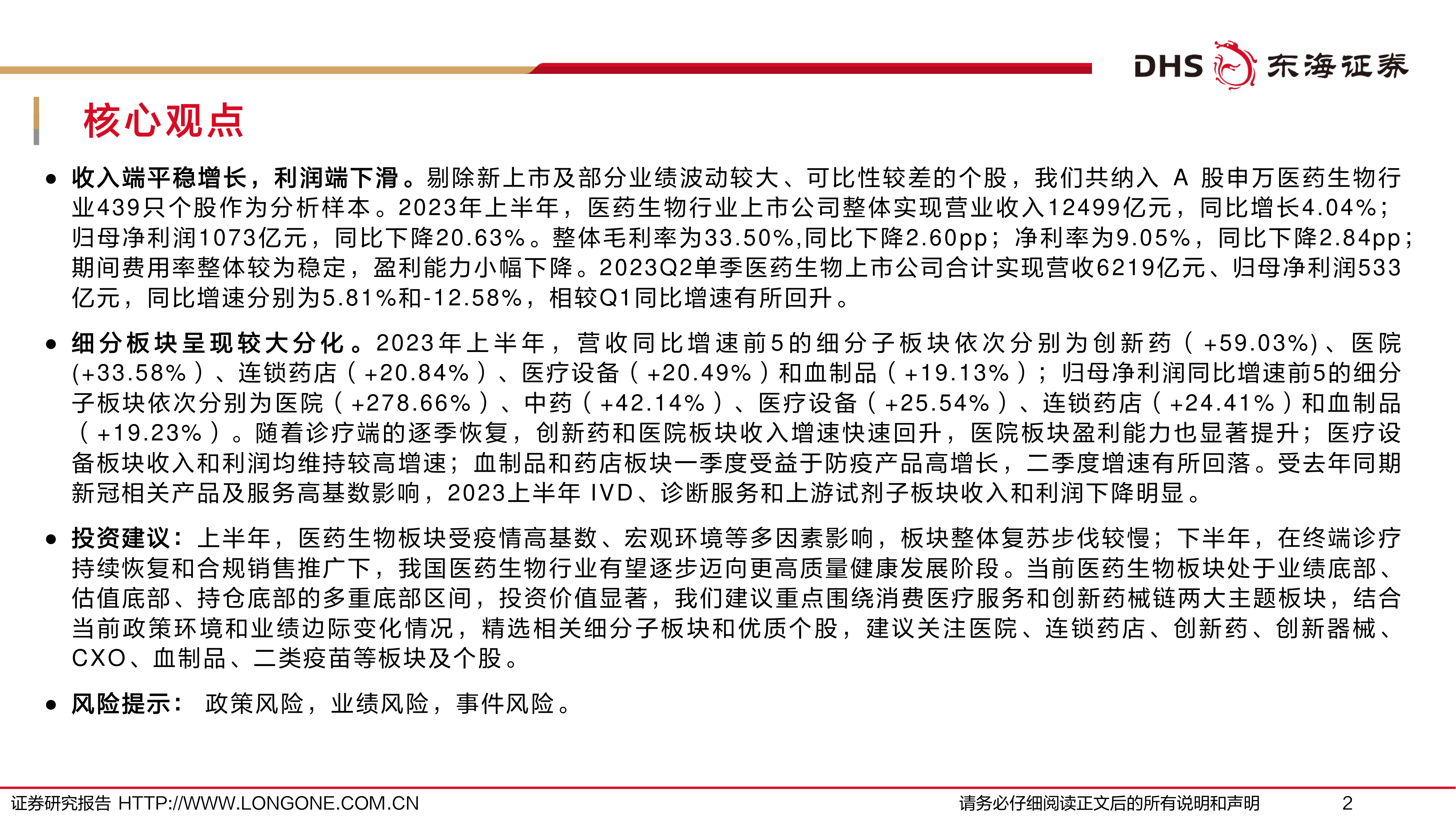 投资建议:上半年,医药生物板块受疫情高基数、宏观环境等多因素影响,板块整体复苏步伐较慢;下半年,在终端诊疗持续恢复和合规销售推广下,我国医药生物行业有望逐步迈向更高质量健康发展阶段。当前医药生物板块处于业绩底部、估值底部、持仓底部的多重底部区间,投资价值显著,我们建议重点围绕消费医疗服务和创新药械链两大主题板块,结合当前政策环境和业绩边际变化情况,精选相关细分子板块和优质个股,建议关注医院、连锁药店、创新药、创新器械、CXO、血制品、二类疫苗等板块及个股。