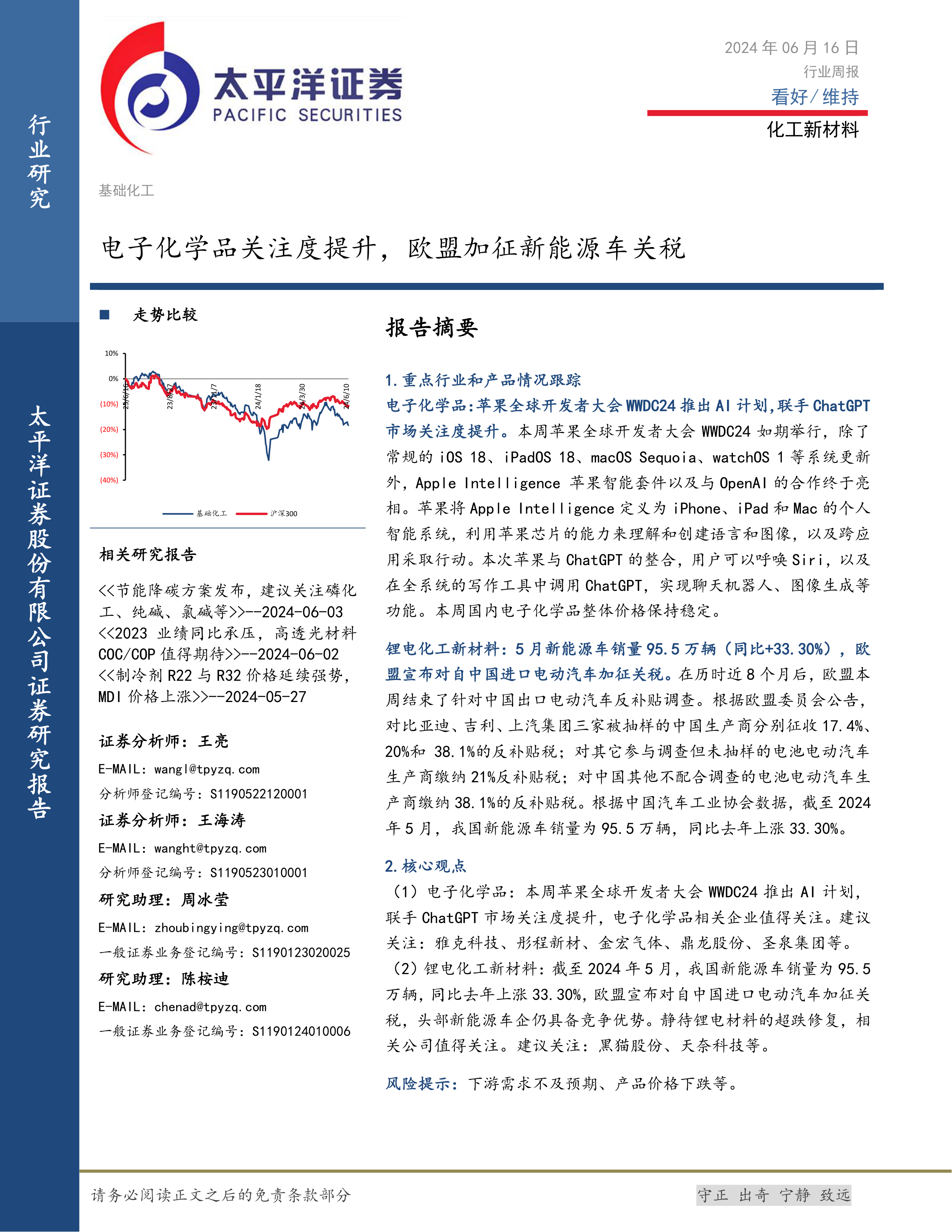(1)电子化学品:本周苹果全球开发者大会WWDC24推出AI计划,联手ChatGPT市场关注度提升,电子化学品相关企业值得关注。建议关注:雅克科技、彤程新材、金宏气体、鼎龙股份、圣泉集团等。(2)锂电化工新材料:截至2024年5月,我国新能源车销量为95.5万辆,同比去年上涨33.30%,欧盟宣布对自中国进口电动汽车加征关税,头部新能源车企仍具备竞争优势。静待锂电材料的超跌修复,相关公司值得关注。建议关注:黑猫股份、天奈科技等。