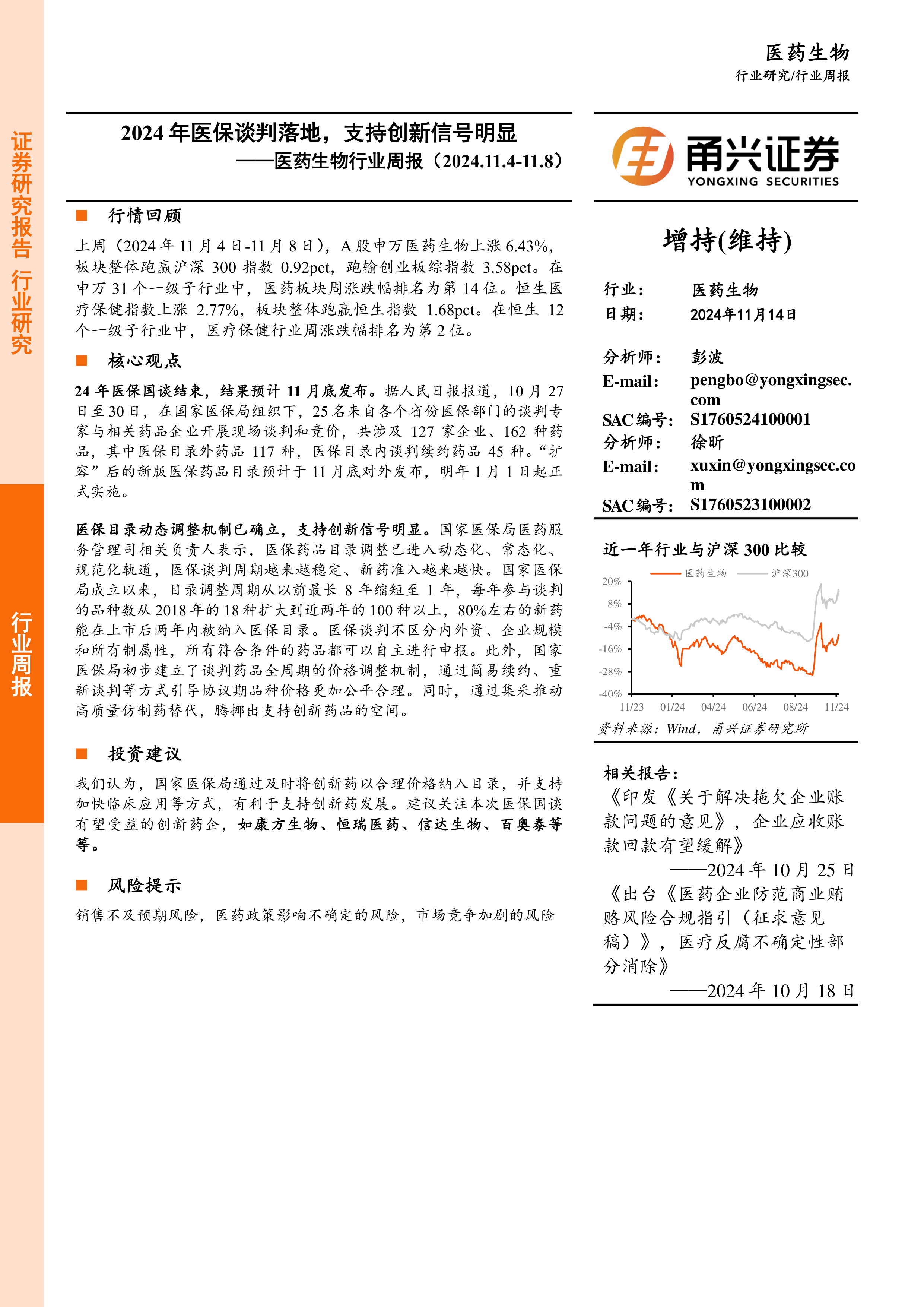 医药生物行业周报:2024年医保谈判落地,支持创新信号明显