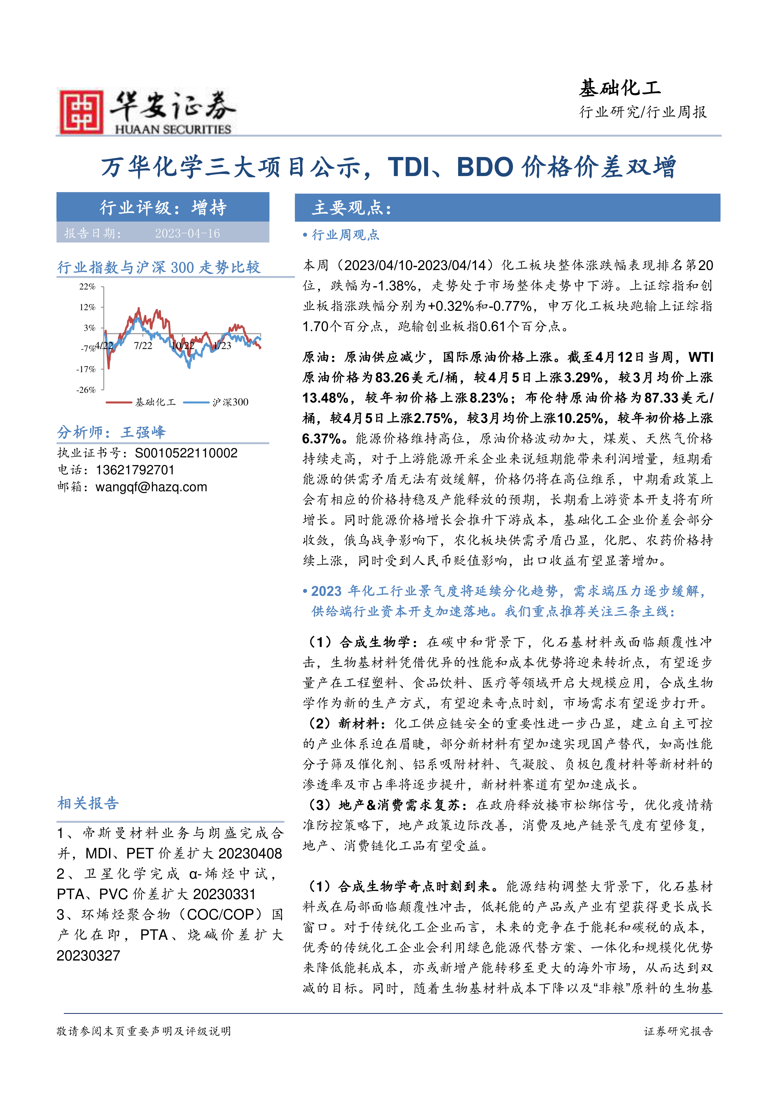 基础化工行业周报:万华化学三大项目公示,TDI、BDO价格价差双增