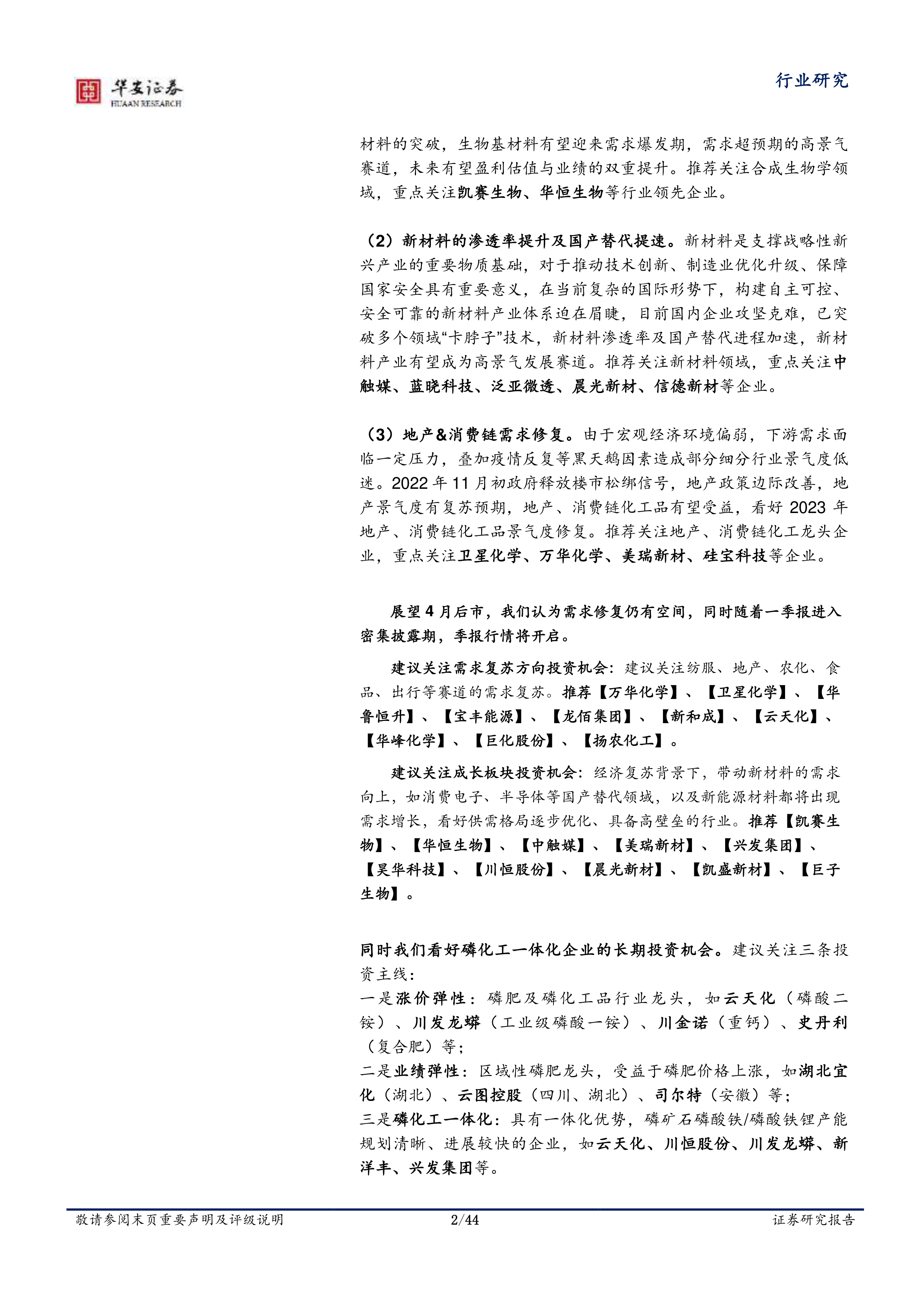 (3)地产&消费链需求修复。由于宏观经济环境偏弱,下游需求面临一定压力,叠加疫情反复等黑天鹅因素造成部分细分行业景气度低迷。2022年11月初政府释放楼市松绑信号,地产政策边际改善,地产景气度有复苏预期,地产、消费链化工品有望受益,看好2023年地产、消费链化工品景气度修复。推荐关注地产、消费链化工龙头企业,重点关注卫星化学、万华化学、美瑞新材、硅宝科技等企业。展望4月后市,我们认为需求修复仍有空间,同时随着一季报进入密集披露期,季报行情将开启。