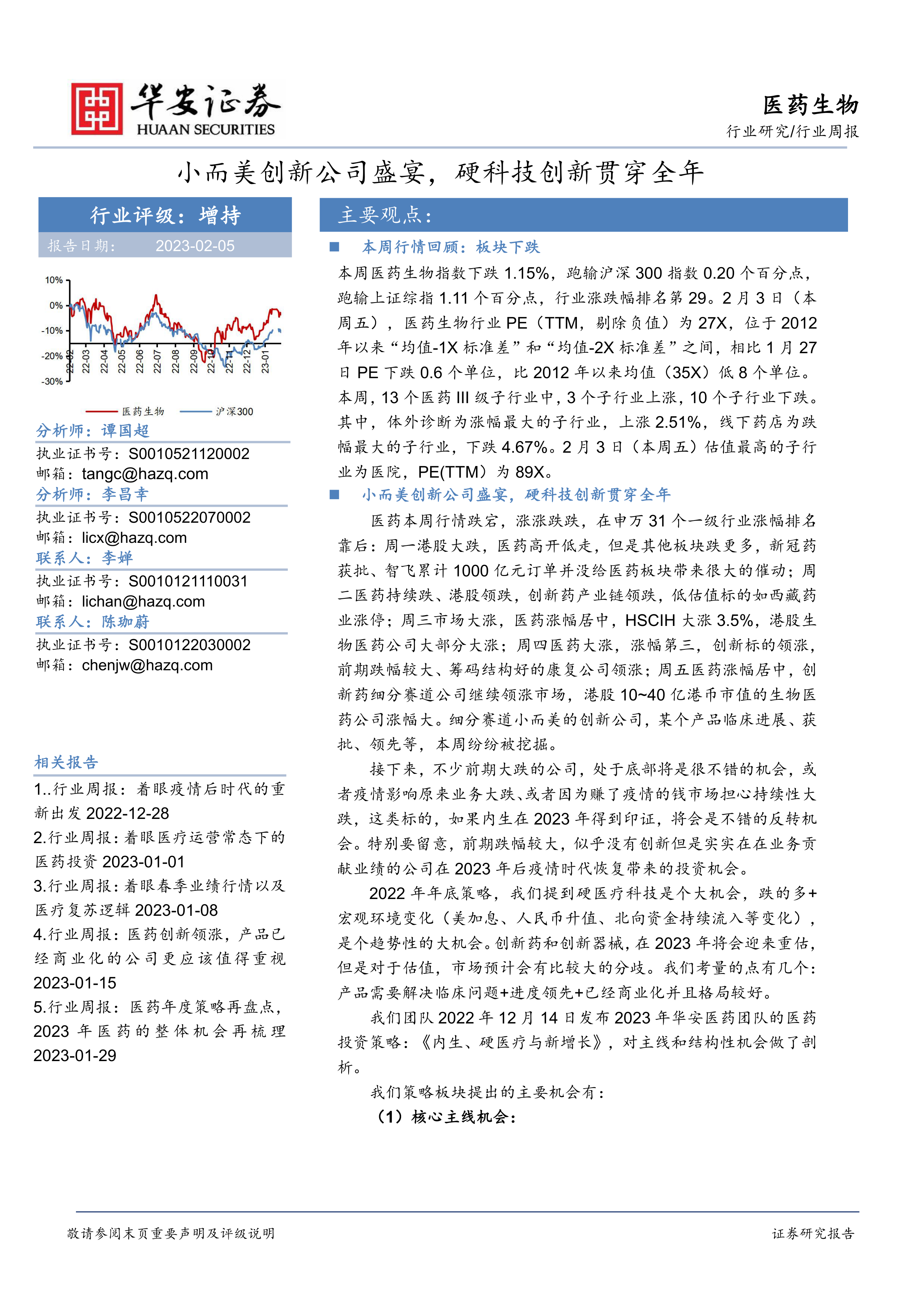 我们团队2022年12月14日发布2023年华安医药团队的医药投资策略:《内生、硬医疗与新增长》,对主线和结构性机会做了剖析。