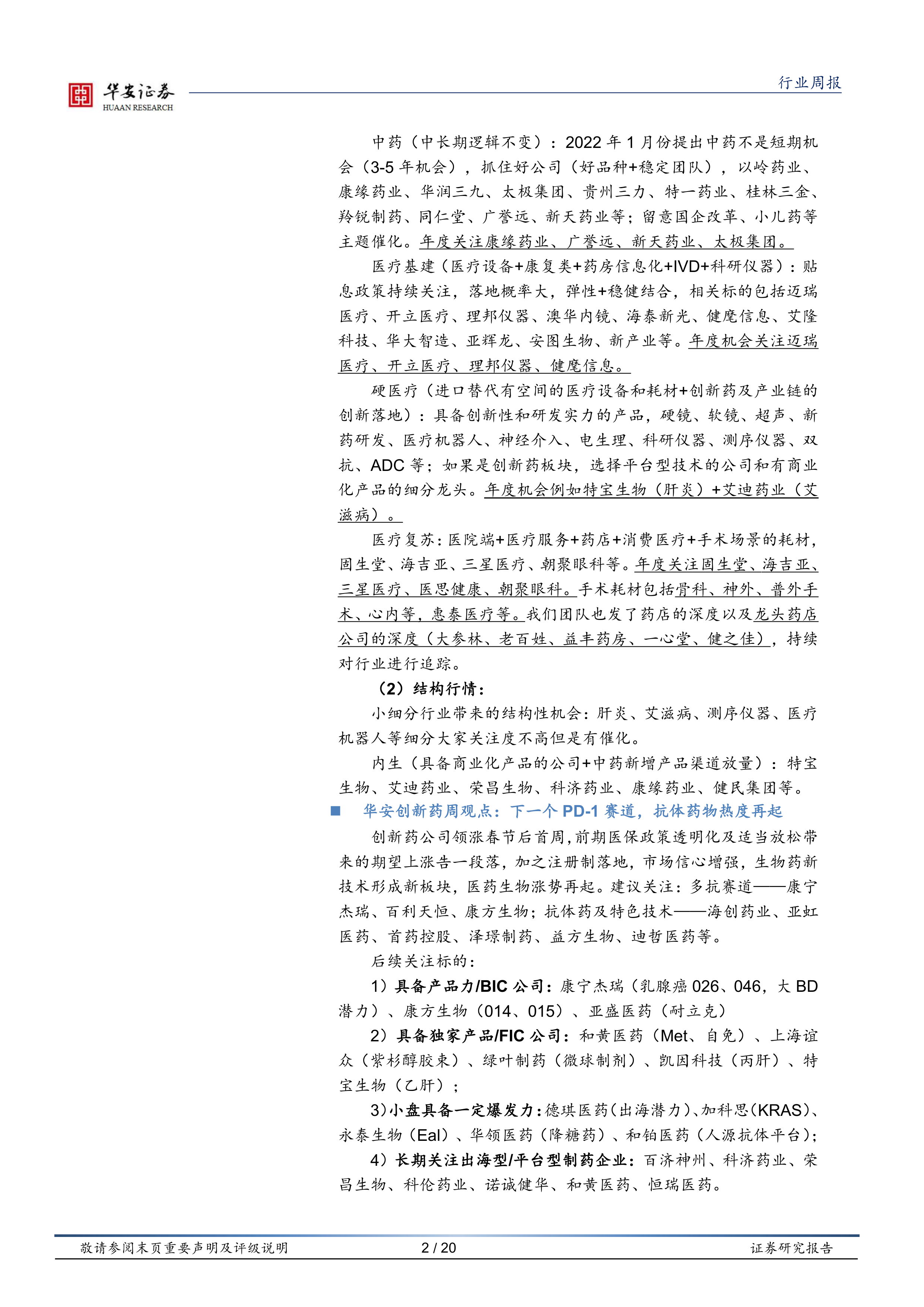 中药(中长期逻辑不变):2022年1月份提出中药不是短期机会(3-5年机会),抓住好公司(好品种+稳定团队),以岭药业、康缘药业、华润三九、太极集团、贵州三力、特一药业、桂林三金、羚锐制药、同仁堂、广誉远、新天药业等;留意国企改革、小儿药等主题催化。年度关注康缘药业、广誉远、新天药业、太极集团。