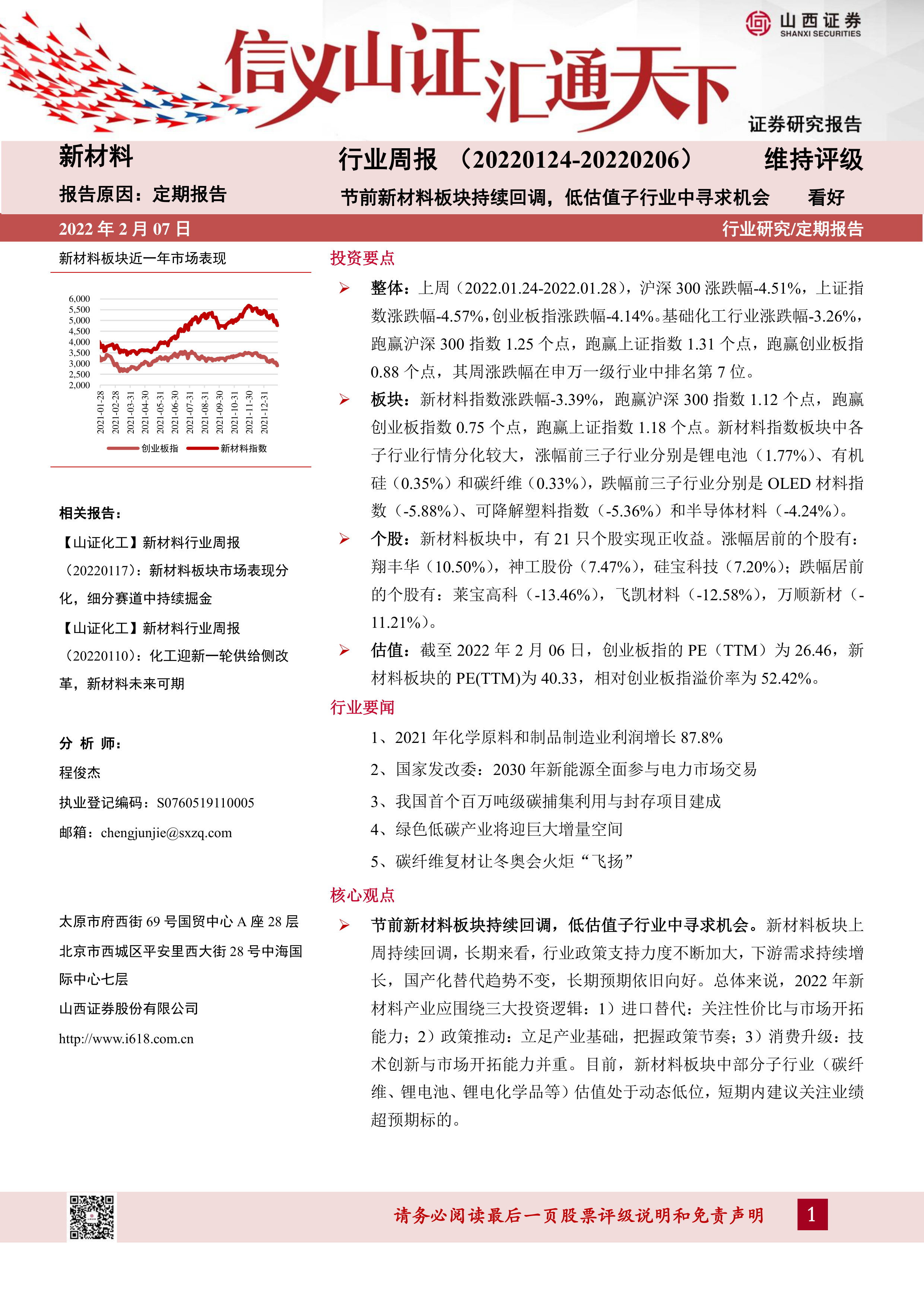 估值:截至2022年2月06日,创业板指的PE(TTM)为26.46,新材料板块的PE(TTM)为40.33,相对创业板指溢价率为52.42%。