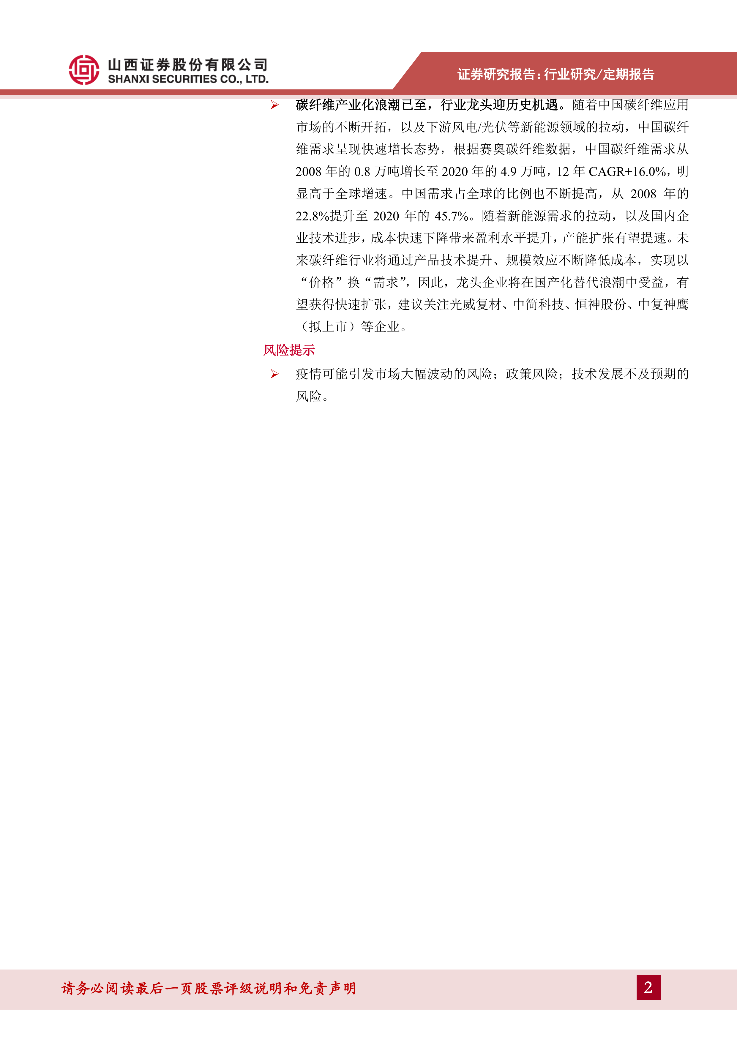 碳纤维产业化浪潮已至,行业龙头迎历史机遇。随着中国碳纤维应用市场的不断开拓,以及下游风电/光伏等新能源领域的拉动,中国碳纤维需求呈现快速增长态势,根据赛奥碳纤维数据,中国碳纤维需求从2008年的0.8万吨增长至2020年的4.9万吨,12年CAGR+16.0%,明显高于全球增速。中国需求占全球的比例也不断提高,从2008年的22.8%提升至2020年的45.7%。随着新能源需求的拉动,以及国内企业技术进步,成本快速下降带来盈利水平提升,产能扩张有望提速。未来碳纤维行业将通过产品技术提升、规模效应不断降低成本,实现以“价格”换“需求”,因此,龙头企业将在国产化替代浪潮中受益,有望获得快速扩张,建议关注光威复材、中简科技、恒神股份、中复神鹰(拟上市)等企业。