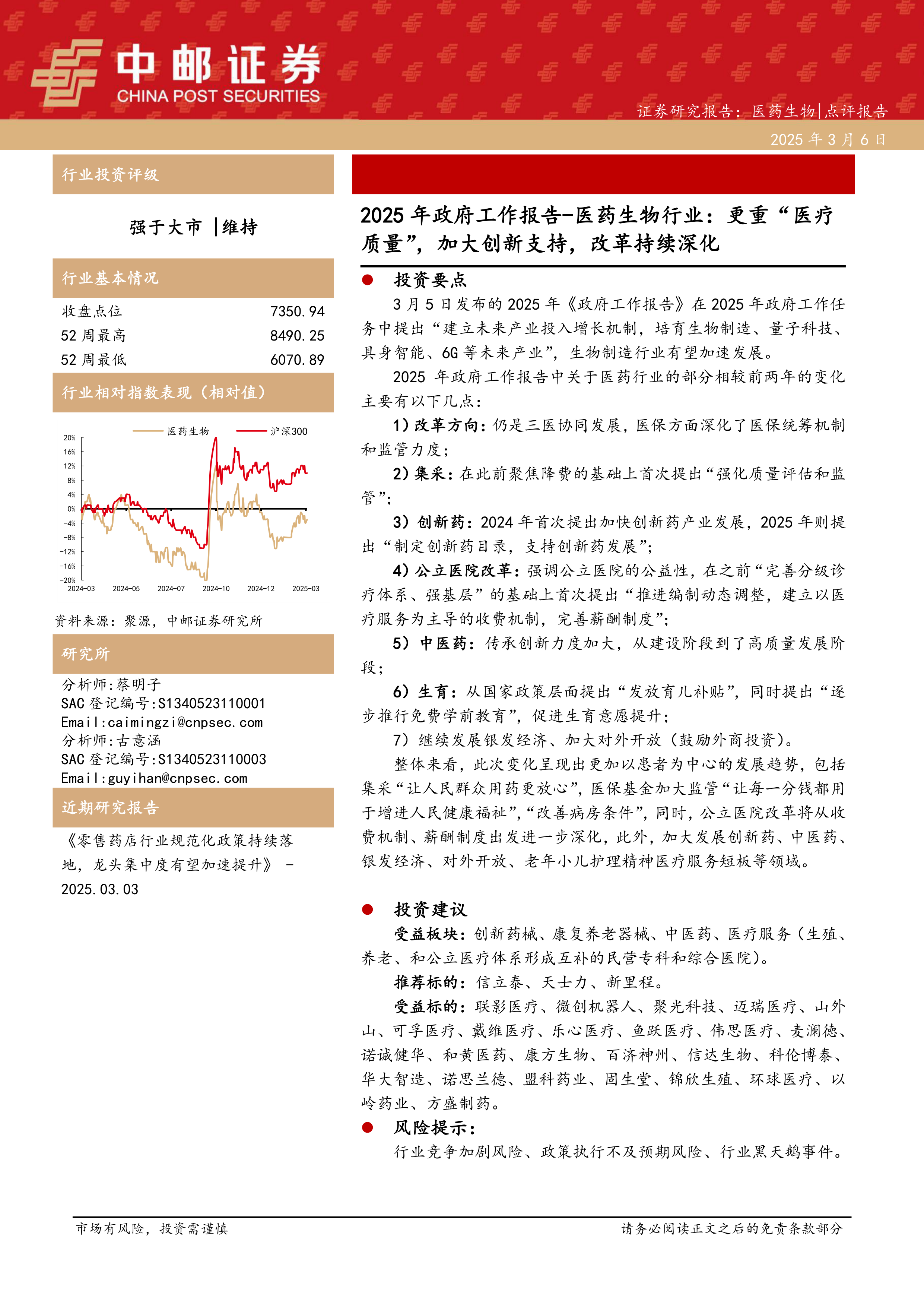 2025年政府工作报告-医药生物行业:更重“医疗质量”,加大创新支持,改革持续深化