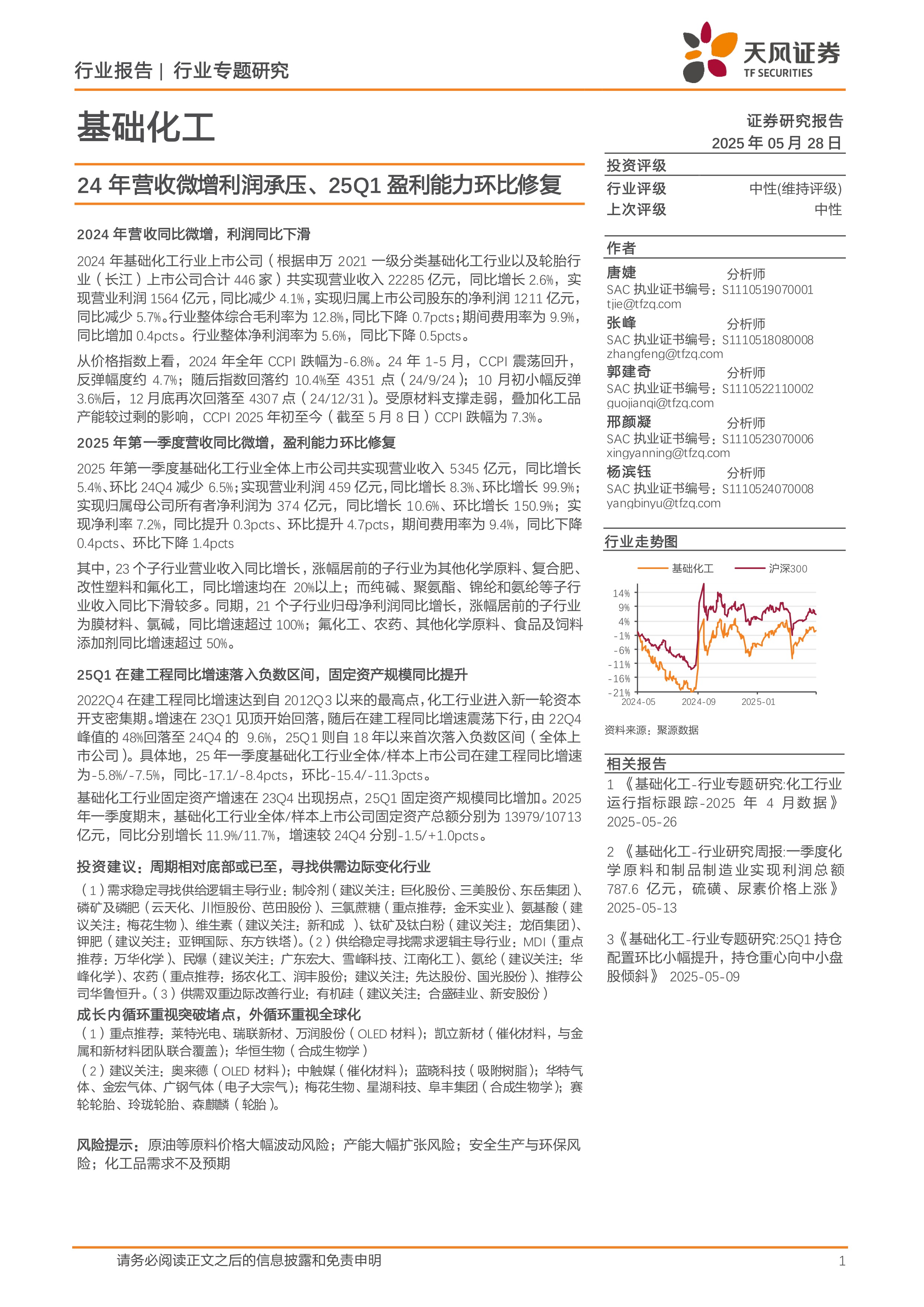 2024年基础化工行业面临营收微增但利润承压的局面,盈利能力指标普遍下滑。然而,2025年第一季度行业展现出显著的盈利能力环比修复,营收持续微增,净利润实现同环比双增,且费用控制有所改善。行业资本开支已过高峰,在建工程增速首次转负,预示着供给端压力减缓,行业正步入供需再平衡阶段。报告判断当前周期可能已至相对底部,建议投资者关注供需边际改善的子行业,并把握内循环新质生产力发展和外循环全球化出海的成长机遇。同时,需警惕原材料价格波动、产能过剩、环保政策趋严及需求不及预期等潜在风险。