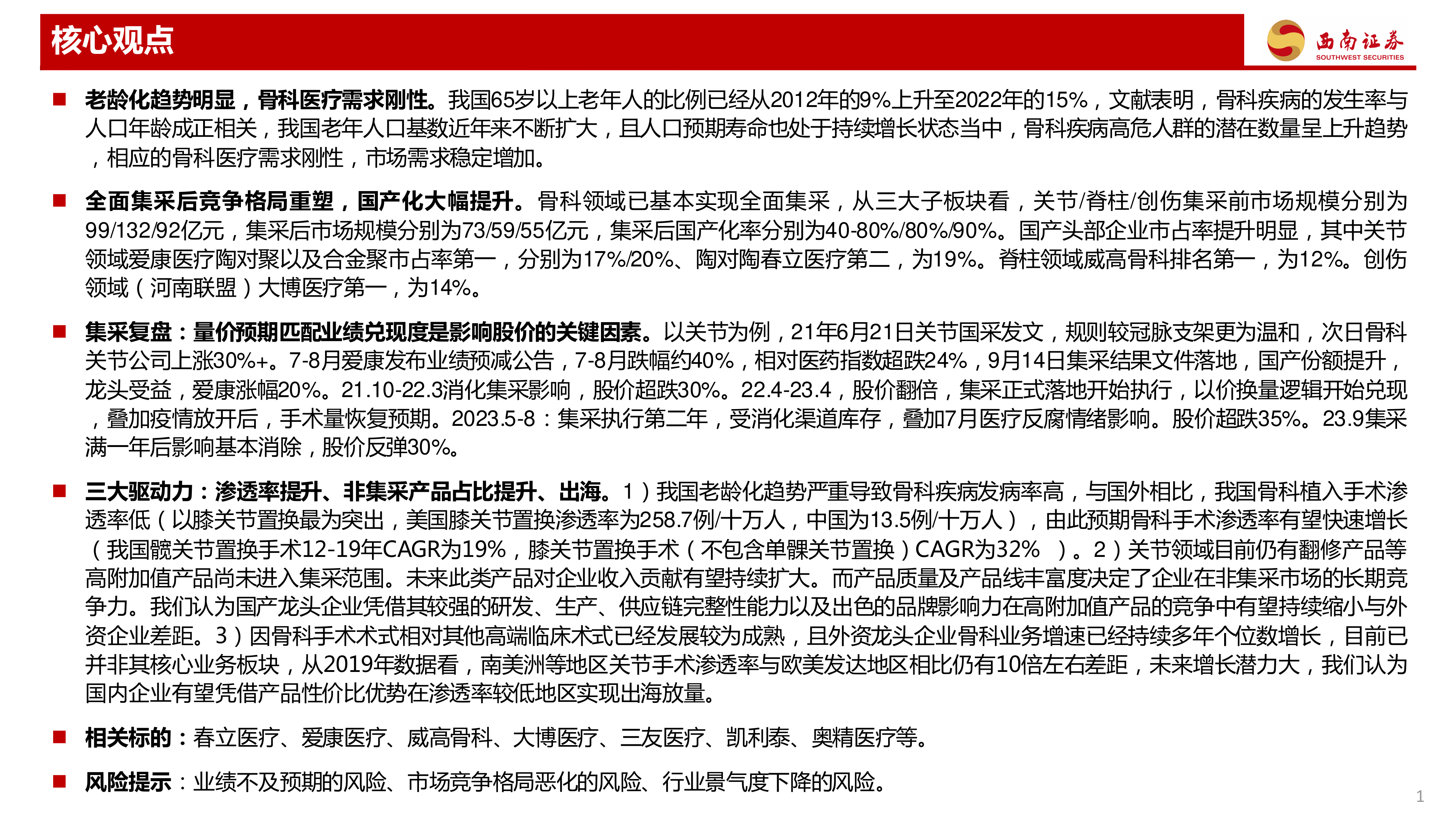 本报告深入分析了全面集采后骨科高值耗材行业的投资机会,核心观点如下: