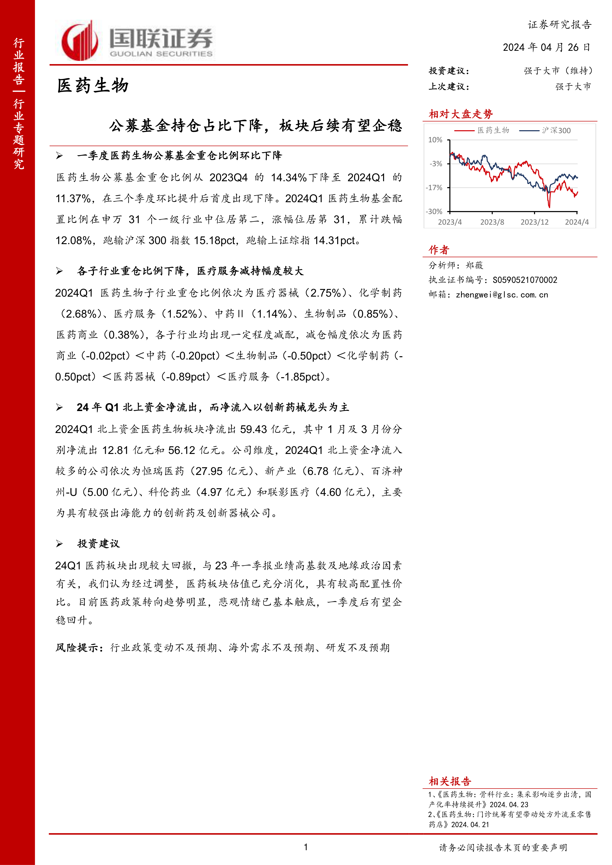 2024年第一季度,医药生物板块经历了公募基金重仓比例下降和北上资金净流出的双重压力,导致市场表现不佳。这主要归因于2023年同期业绩高基数以及地缘政治等宏观因素的影响。然而,报告分析认为,经过此轮调整,医药板块的估值已得到充分消化,配置性价比显著提升。随着医药政策环境的积极变化和市场悲观情绪的触底,预计该板块有望在第一季度后企稳并迎来回升。投资者在关注行业整体趋势的同时,也需警惕行业政策变动不及预期、海外需求不及预期以及研发不及预期等潜在风险。