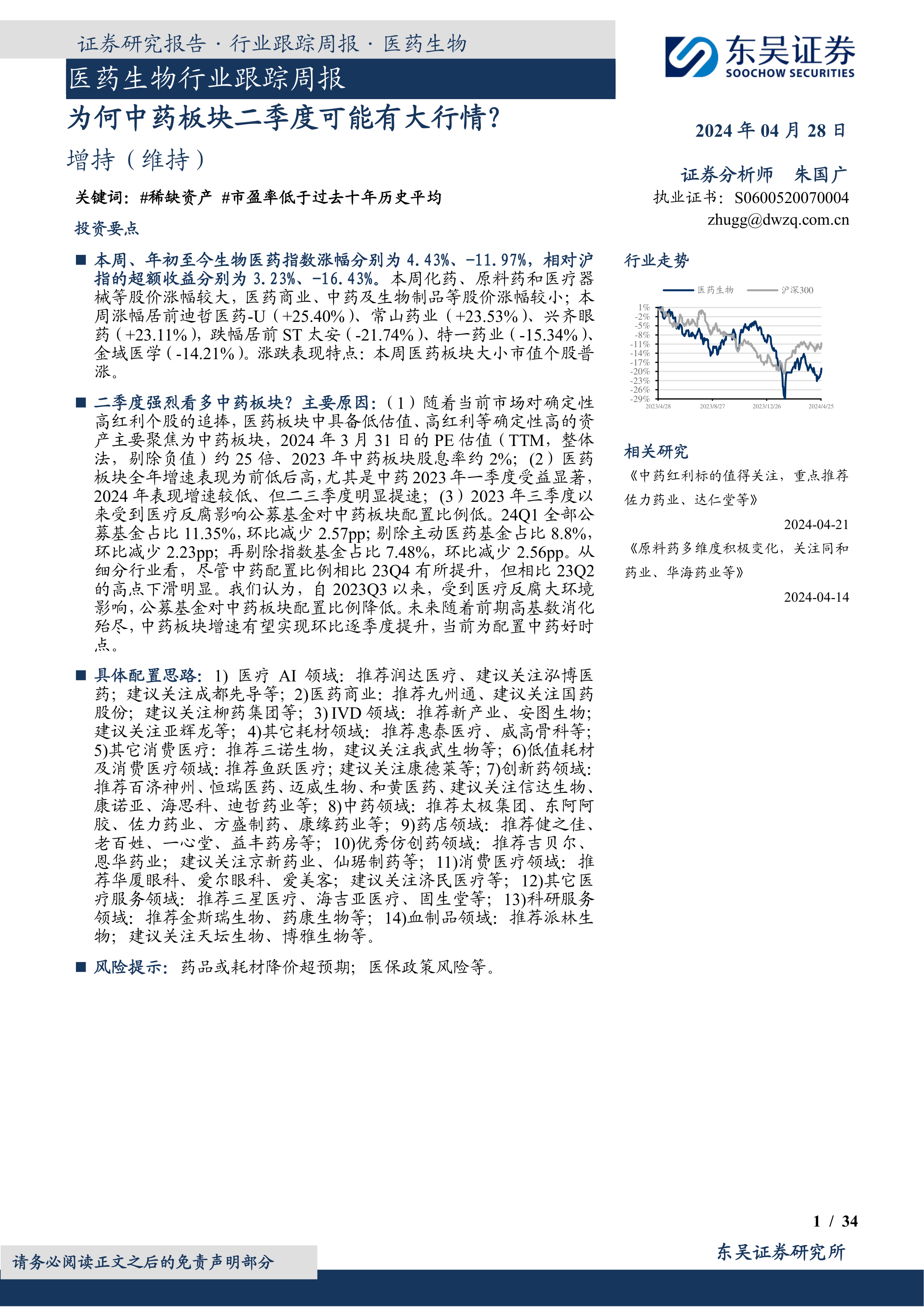本报告对医药生物行业进行了深入分析,核心观点在于强烈看好中药板块在2024年第二季度的投资机会。中药板块凭借其低估值、高股息的确定性特征,以及在医疗反腐背景下公募基金配置比例处于低位,加之未来业绩增速有望逐季提升的预期,展现出显著的投资吸引力。报告通过详尽的数据和市场分析,阐述了中药院外OTC市场的增长潜力以及院内处方市场的预期差,并强调了国家政策对中医药传承创新发展的持续支持。