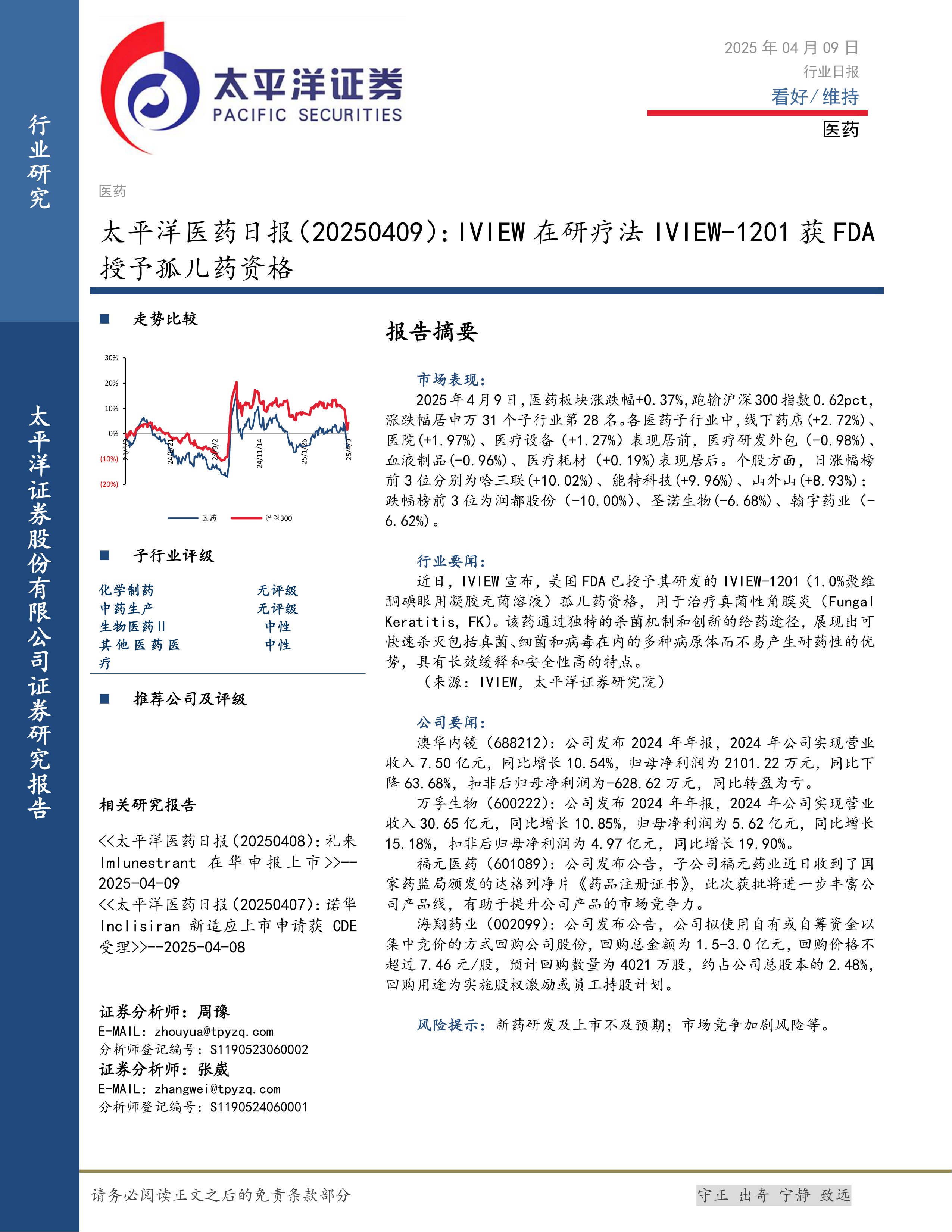 本报告对2025年4月9日医药行业的市场表现、行业动态和公司要闻进行了分析。医药板块整体表现略逊于大盘,子行业间存在明显分化。IVIEW-1201获得FDA孤儿药资格,预示着创新疗法在医药领域的重要机遇。