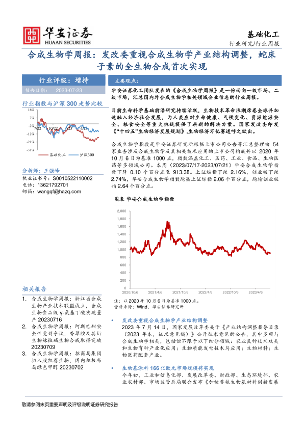 合成生物学指数是华安证券研究所根据上市公司公告等汇总整理由54家业务涉及合成生物学及其相关技术应用的上市公司构成并以2020年10月6日为基准1000点,指数涵盖化工、医药、工业、食品、生物医药等多领域公司。本周(2023/07/17-2023/07/21)华安合成生物学指数下降0.10个百分点至913.38。上证综指下跌2.16%,创业板下跌2.74%,华安合成生物学指数跑赢上证综指2.06个百分点,跑输创业板指2.64个百分点。
