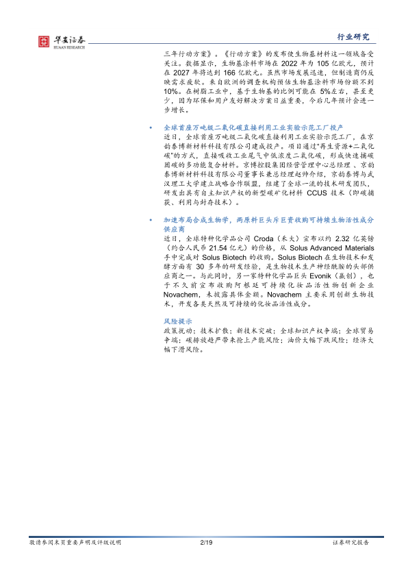 今年初,工业和信息化部、发展改革委、财政部、生态环境部、农业农村部、市场监管总局联合发布《加快非粮生物基材料创新发展三年行动方案》。《行动方案》的发布使生物基材料这一领域备受关注。数据显示,生物基涂料市场在2022年为105亿欧元,预计在2027年将达到166亿欧元。虽然市场发展迅速,但制造商仍反映需求疲软。来自欧洲的调查机构预估生物基涂料市场份额不到10%。在树脂工业中,基于生物基的比例可能在5%左右,甚至更少,因为环保和用户友好解决方案日益重要,今后几年预计会进一步增长。