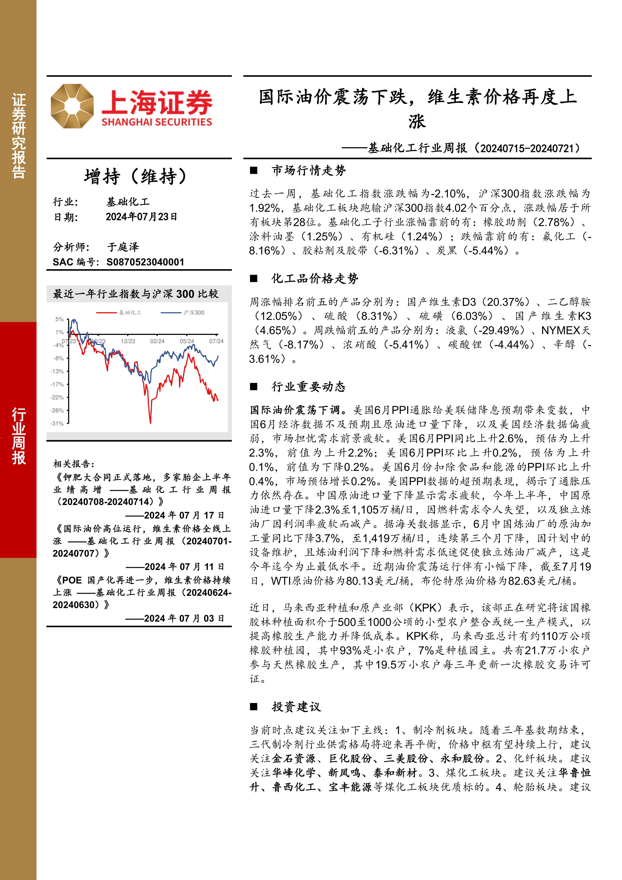 本报告深入分析了2024年7月15日至7月21日基础化工行业的市场表现,指出该板块整体跑输大盘,但内部子行业及产品价格呈现显著分化。国际油价震荡下调,受全球经济数据不及预期及需求疲软担忧影响,为市场带来不确定性。然而,部分维生素产品价格逆势大幅上涨,而液氯等产品则经历显著下跌。
