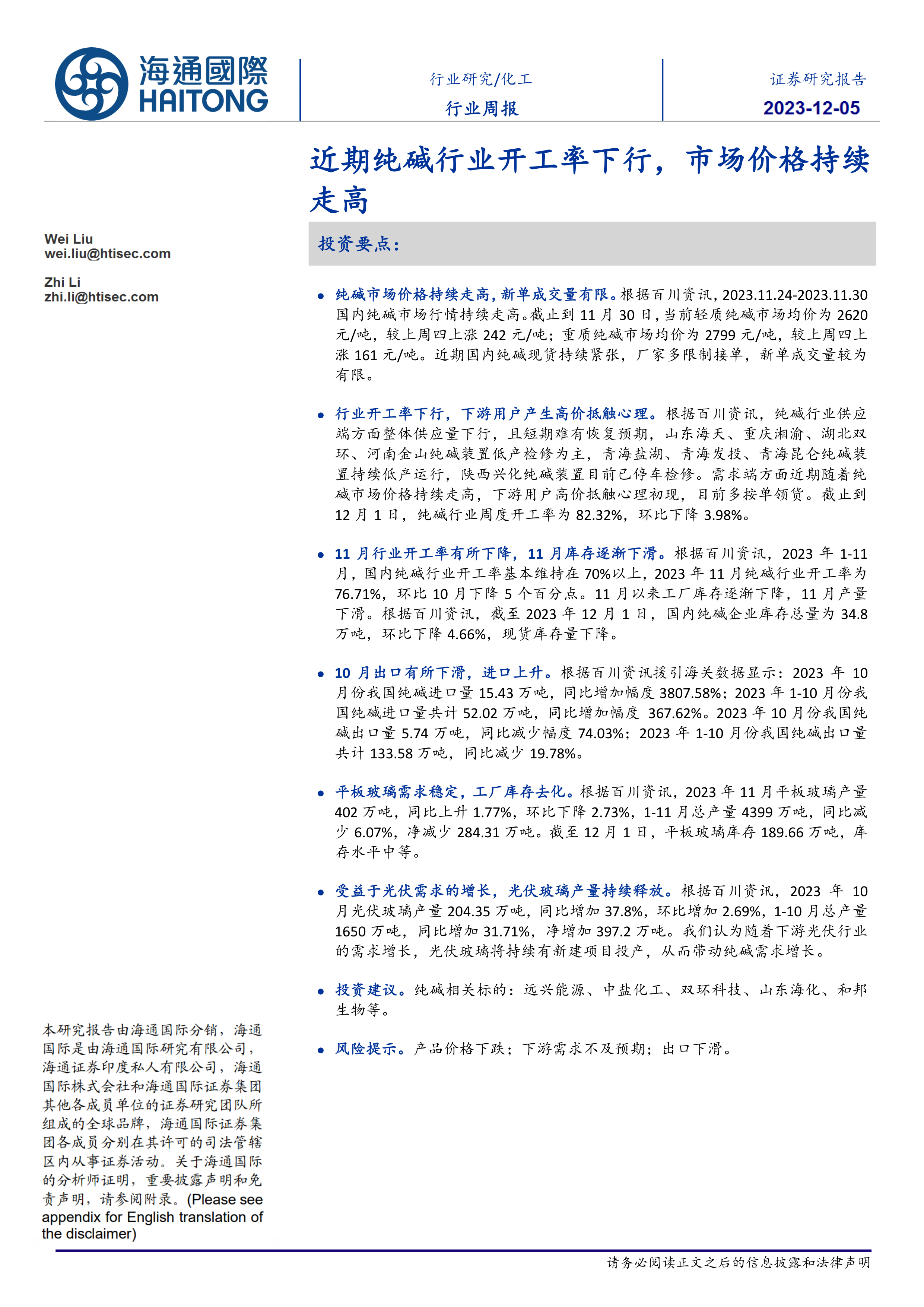 化工行业周报:近期纯碱行业开工率下行,市场价格持续走高