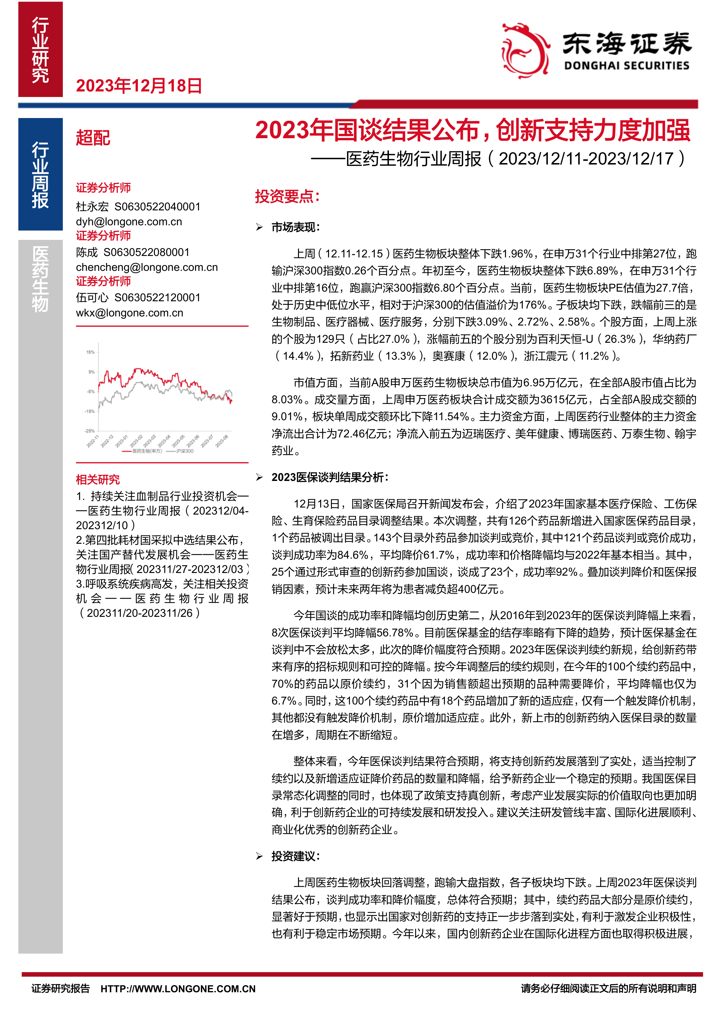 医药生物行业周报:2023年国谈结果公布,创新支持力度加强