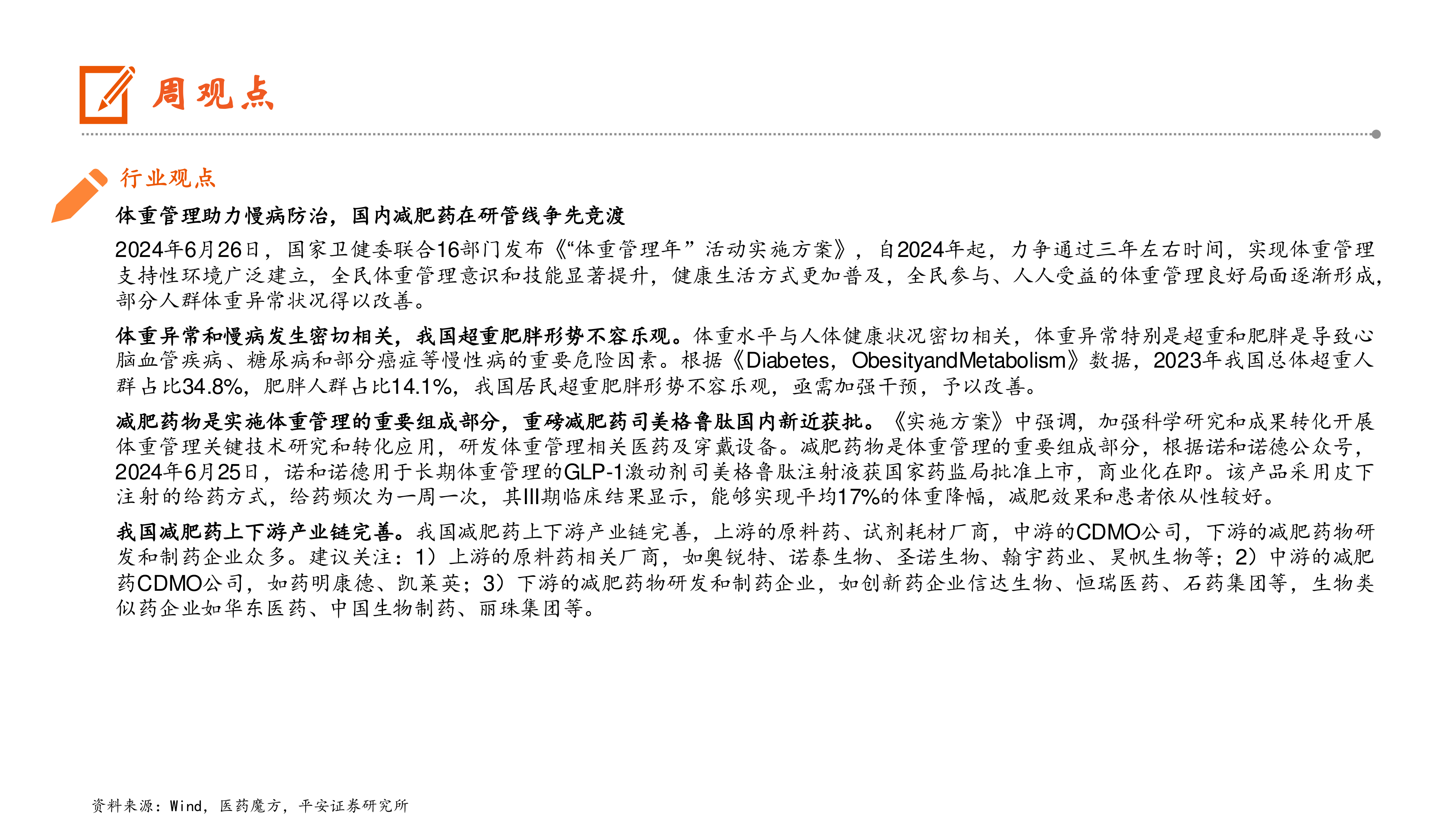 政策推动体重管理,减肥药市场潜力巨大 2024年6月26日,国家卫健委等16部门启动“体重管理年”活动,旨在通过三年左右时间,广泛建立体重管理支持性环境,提升全民意识和技能,改善部分人群体重异常状况。体重异常(特别是超重和肥胖)是心脑血管疾病、糖尿病和部分癌症等慢性病的重要危险因素。2023年数据显示,我国总体超重人群占比34.8%,肥胖人群占比14.1%,形势不容乐观,亟需加强干预。减肥药物是体重管理的关键组成部分。诺和诺德的GLP-1激动剂司美格鲁肽注射液于2024年6月25日获国家药监局批准上市,用于长期体重管理,其III期临床显示能够实现平均17%的体重降幅,具有良好的减肥效果和患者依从性。我国减肥药产业链完善,涵盖上游原料药、中游CDMO和下游研发制药企业。建议关注上游原料药相关厂商(如奥锐特、诺泰生物等)、中游CDMO公司(如药明康德、凯莱英)以及下游减肥药物研发和制药企业(如信达生物、恒瑞医药、华东医药等)。