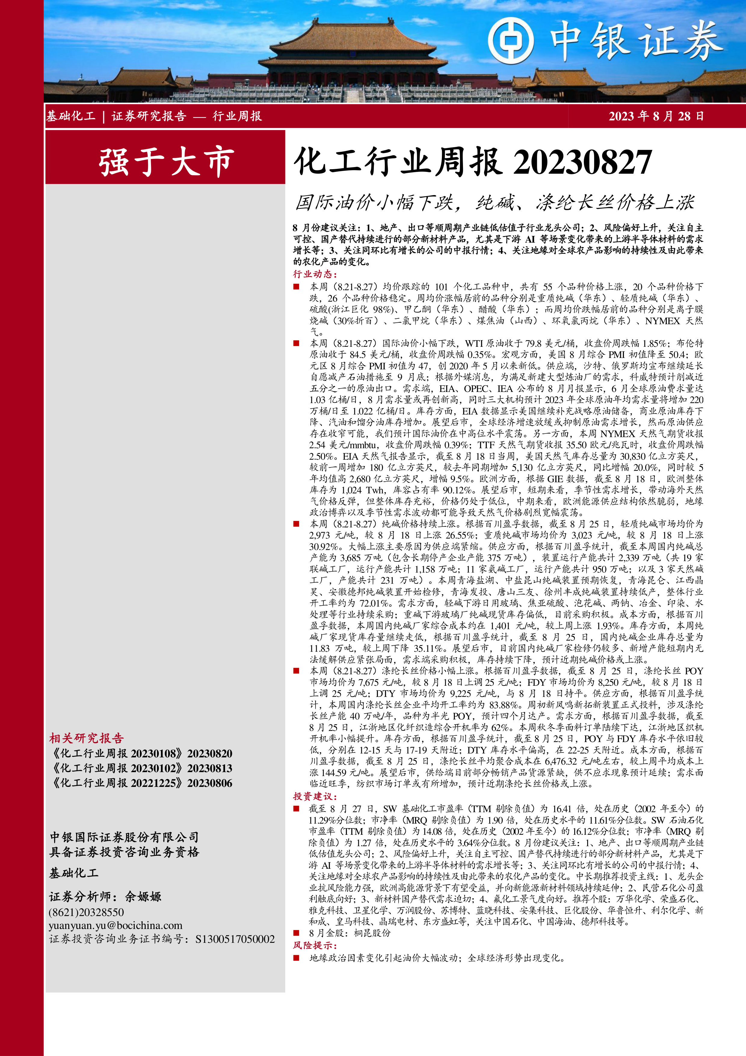 本报告对2023年8月21日至8月27日的基础化工行业进行了深入分析,指出当前市场环境下,化工行业整体表现出“强于大市”的评级。核心观点在于,尽管国际油价小幅下跌,但纯碱和涤纶长丝等部分化工产品价格因供需关系和库存水平持续上涨。投资策略建议关注顺周期产业链的低估值龙头公司、自主可控的新材料(特别是半导体材料)、中报业绩增长公司以及农化产品受地缘影响的变化。中长期来看,龙头企业在欧洲高能源背景下的优势、民营石化盈利触底回升、新材料国产替代需求以及氟化工景气度向好是主要投资主线。