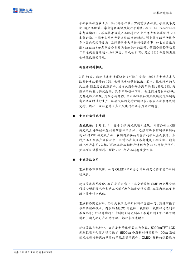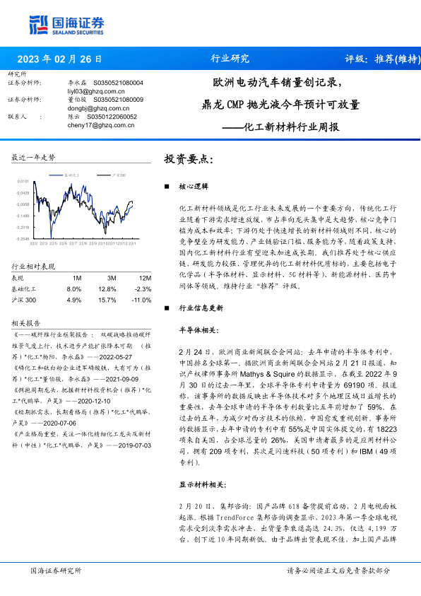 化工新材料行业周报:欧洲电动汽车销量创记录,鼎龙CMP抛光液今年预计可放量