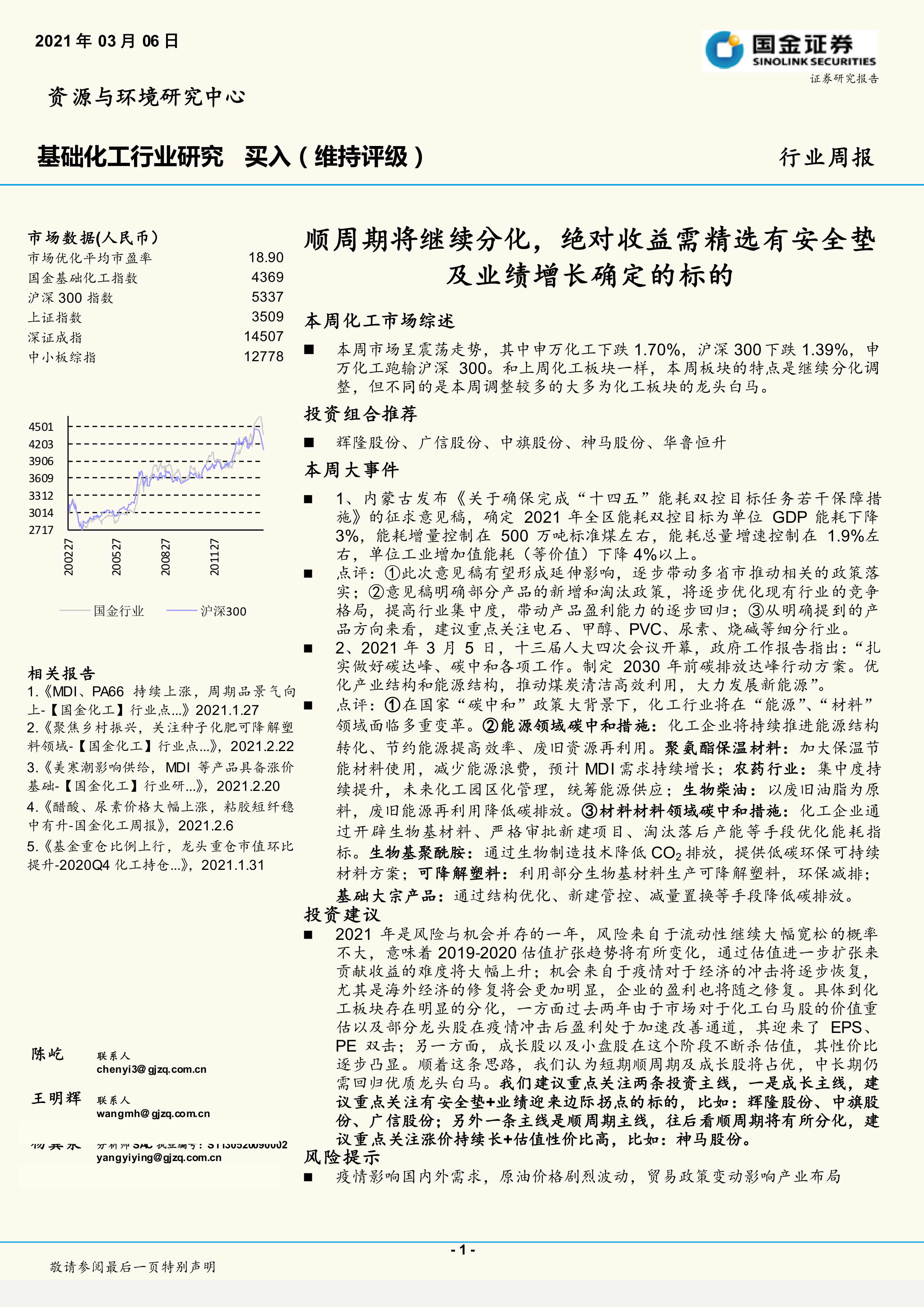 2021 年是风险与机会并存的一年,风险来自于流动性继续大幅宽松的概率不大,意味着 2019- 2020 估值扩张趋势将有所变化,通过估值进一步扩张来贡献收益的难度将大幅上升;机会来自于疫情对于经济的冲击将逐步恢复,尤其是海外经济的修复将会更加明显,企业的盈利也将随之修复。具体到化工板块存在明显的分化,一方面过去两年由于市场对于化工白马股的价值重估以及部分龙头股在疫情冲击后盈利处于加速改善通道,其迎来了 EPS、PE 双击;另一方面,成长股以及小盘股在这个阶段不断杀估值,其性价比逐步凸显。顺着这条思路,我们认为短期顺周期及成长股将占优,中长期仍需回归优质龙头白马。我们建议重点关注两条投资主线,一是成长主线,建议重点关注有安全垫+业绩迎来边际拐点的标的,比如:辉隆股份、中旗股份、广信股份;另外一条主线是顺周期主线,往后看顺周期将有所分化,建议重点关注涨价持续长+估值性价比高,比如:神马股份。
