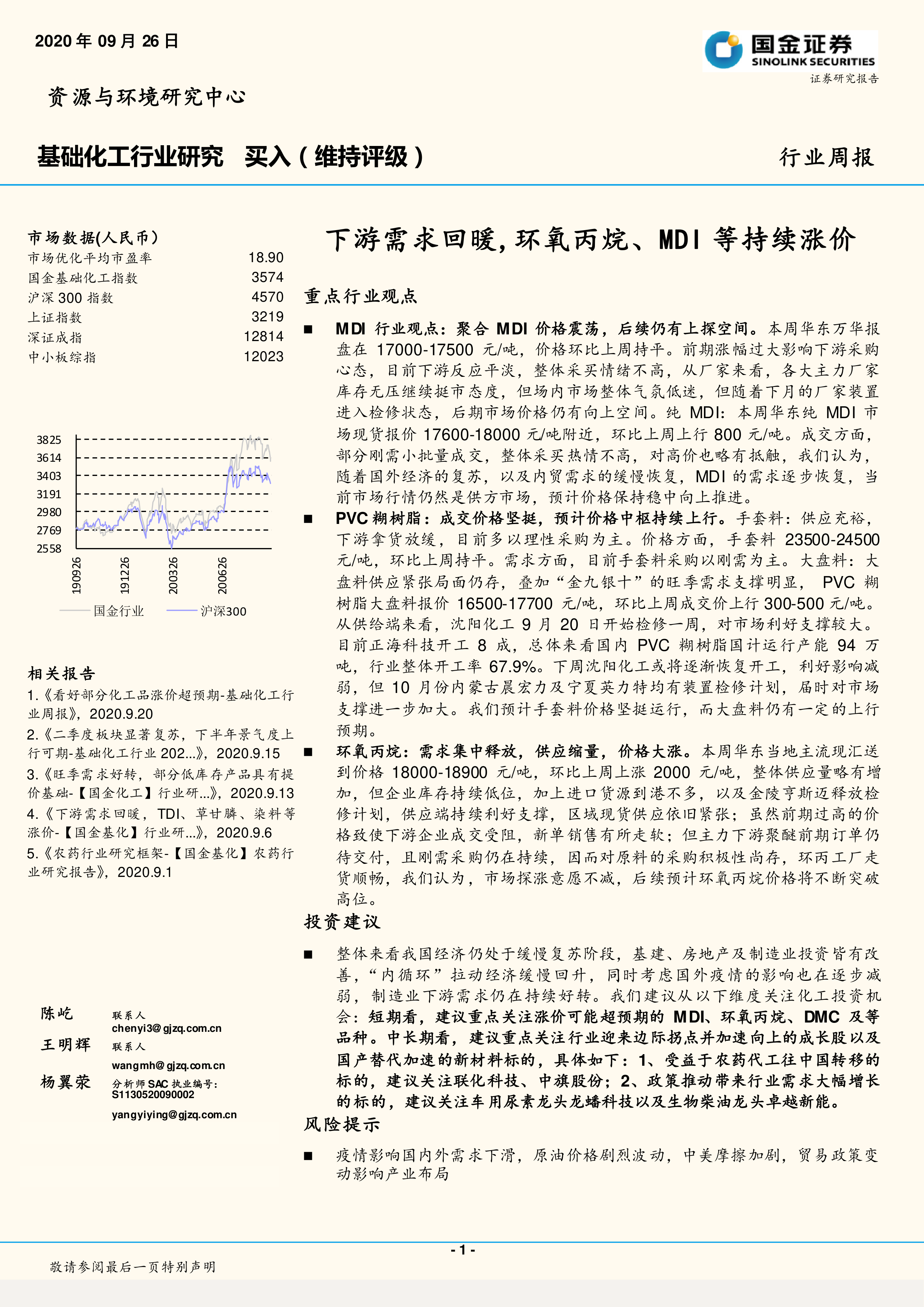 基础化工行业周报:下游需求回暖,环氧丙烷、MDI等持续涨价