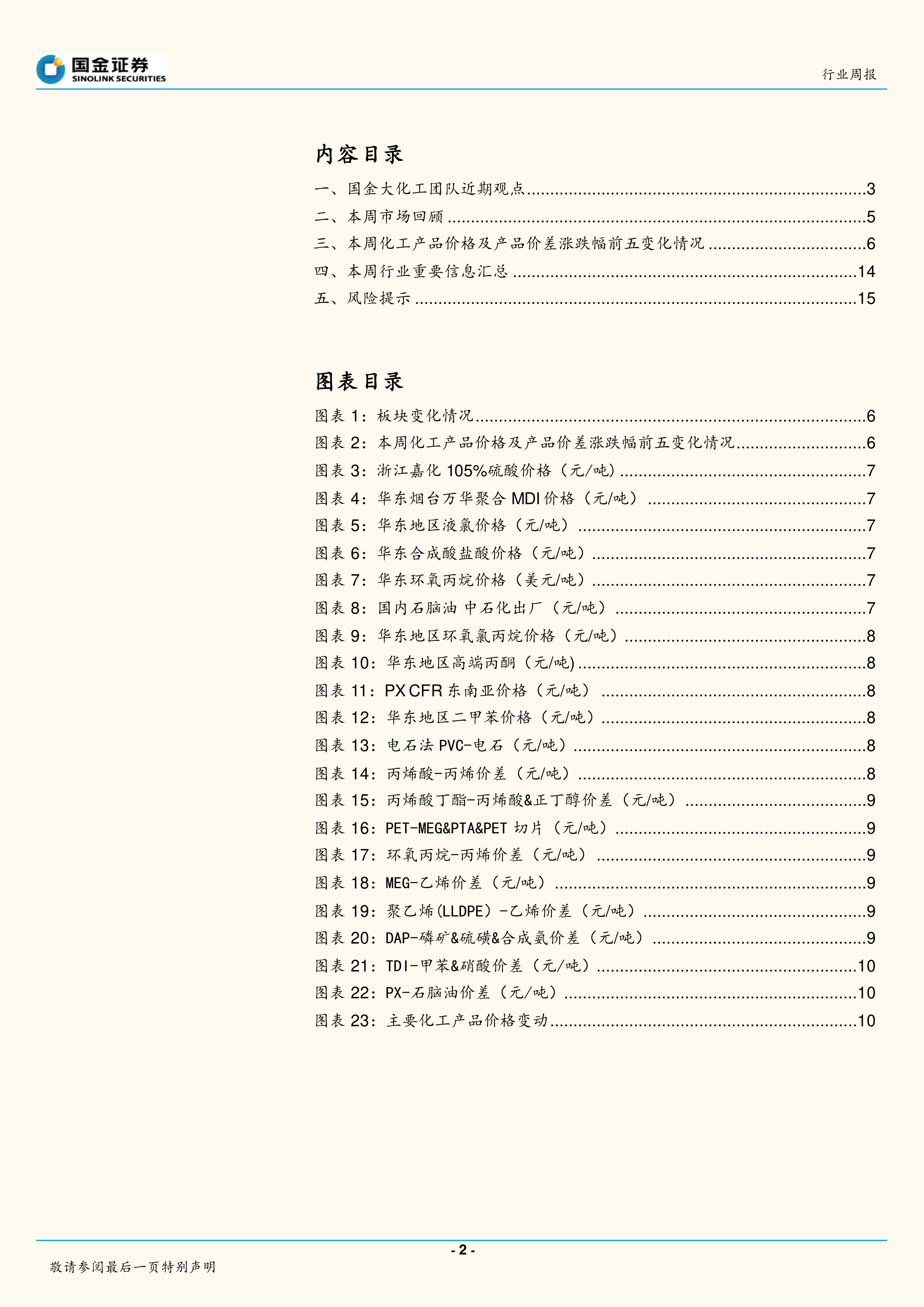 本周行业重要信息包括:霍尼韦尔UOP PSA装置为恒力石化提供高纯度氢气,氢气产能约为140万标方/小时;丰山集团投资16.30亿元在广安建设精细化工产品及农药中间体生产基地;上海市政府印发《关于全面加强危险化学品安全生产工作的实施意见》,力争2023年底前基本建成危化品精细精准安全管控体系;浙江省出台长江经济带化工产业污染防治与绿色发展方案,加快建成高端化、特色化、智能化的现代化工业体系;巴斯夫计划调整全球业务服务部,将减员最多2000人;神华榆林项目系统工程酸碱站正式投用,该项目建设规模为180万吨/年甲醇和40万吨/年乙二醇装置。