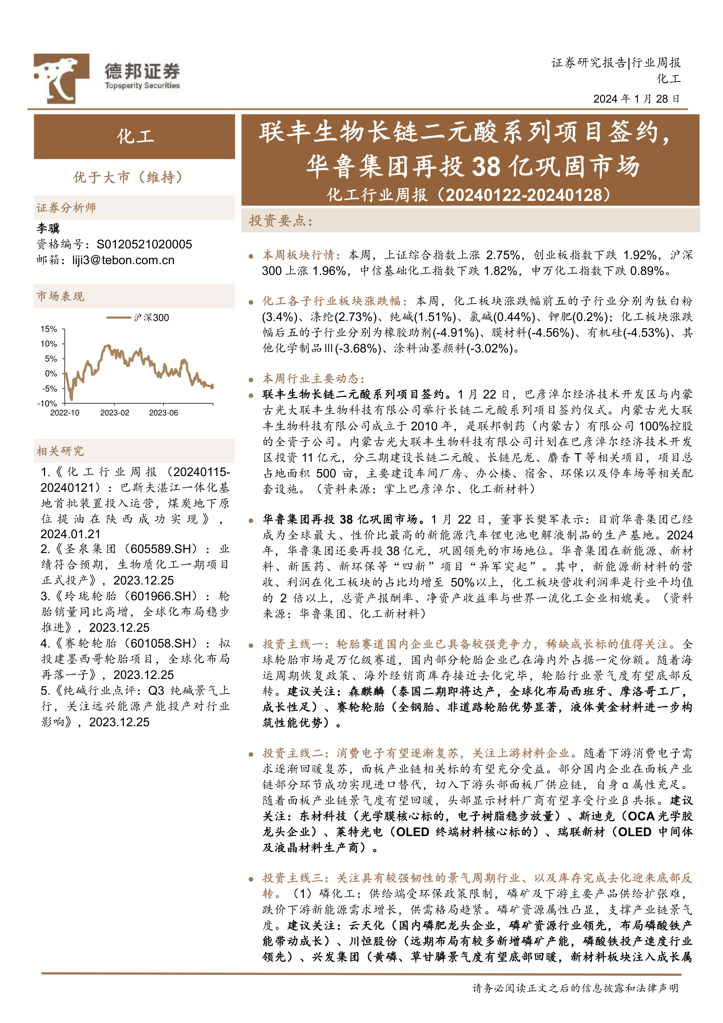 化工行业周报:联丰生物长链二元酸系列项目签约,华鲁集团再投38亿巩固市场