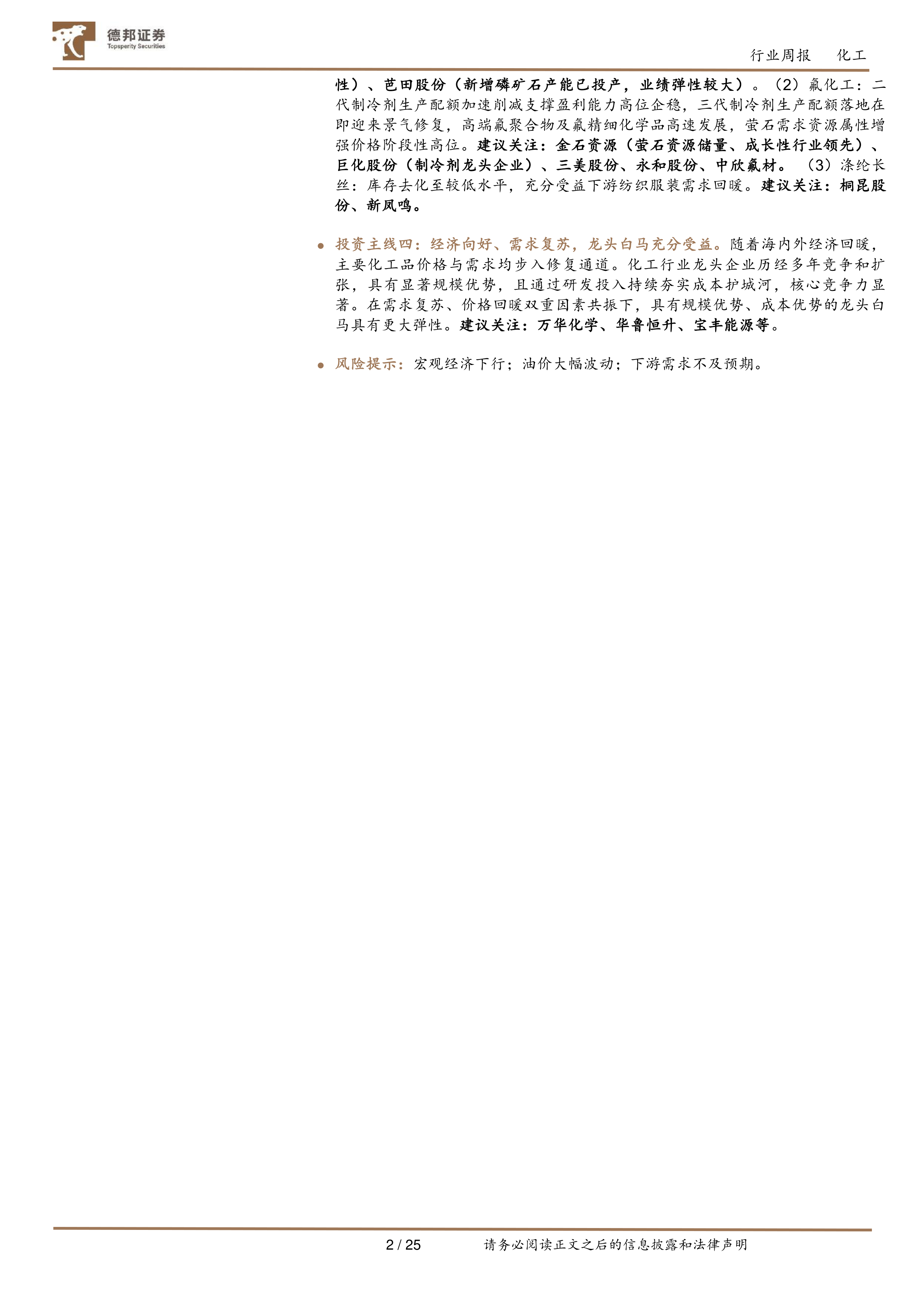 投资主线三:关注具有较强韧性的景气周期行业、以及库存完成去化迎来底部反转。(1)磷化工:供给端受环保政策限制,磷矿及下游主要产品供给扩张难,跌价下游新能源需求增长,供需格局趋紧。磷矿资源属性凸显,支撑产业链景气度。建议关注:云天化(国内磷肥龙头企业,磷矿资源行业领先,布局磷酸铁产能带动成长)、川恒股份(远期布局有较多新增磷矿产能,磷酸铁投产速度行业领先)、兴发集团(黄磷、草甘膦景气度有望底部回暖,新材料板块注入成长属性)、芭田股份(新增磷矿石产能已投产,业绩弹性较大)。(2)氟化工:二代制冷剂生产配额加速削减支撑盈利能力高位企稳,三代制冷剂生产配额落地在即迎来景气修复,高端氟聚合物及氟精细化学品高速发展,萤石需求资源属性增强价格阶段性高位。建议关注:金石资源(萤石资源储量、成长性行业领先)、巨化股份(制冷剂龙头企业)、三美股份、永和股份、中欣氟材。(3)涤纶长丝:库存去化至较低水平,充分受益下游纺织服装需求回暖。建议关注:桐昆股份、新凤鸣。