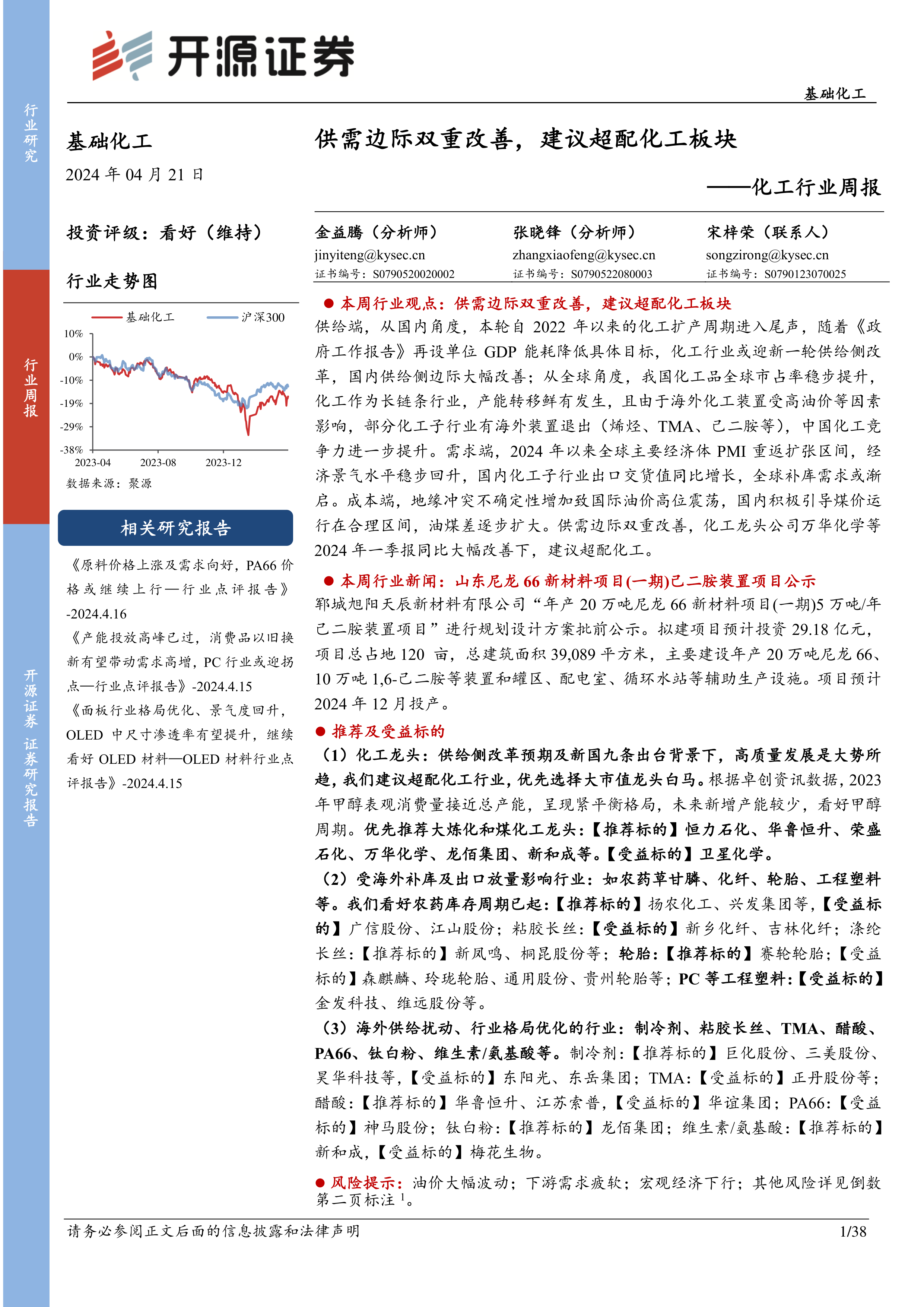 本周基础化工行业在供需边际双重改善的驱动下,整体呈现出积极的投资信号。尽管化工行业指数短期跑输大盘,但多数龙头企业一季度业绩同比大幅改善,印证了行业景气度的回升。供给侧改革、国内产能周期结束以及全球市场份额提升为行业提供了结构性利好,而全球经济复苏、补库需求启动则支撑了需求端。