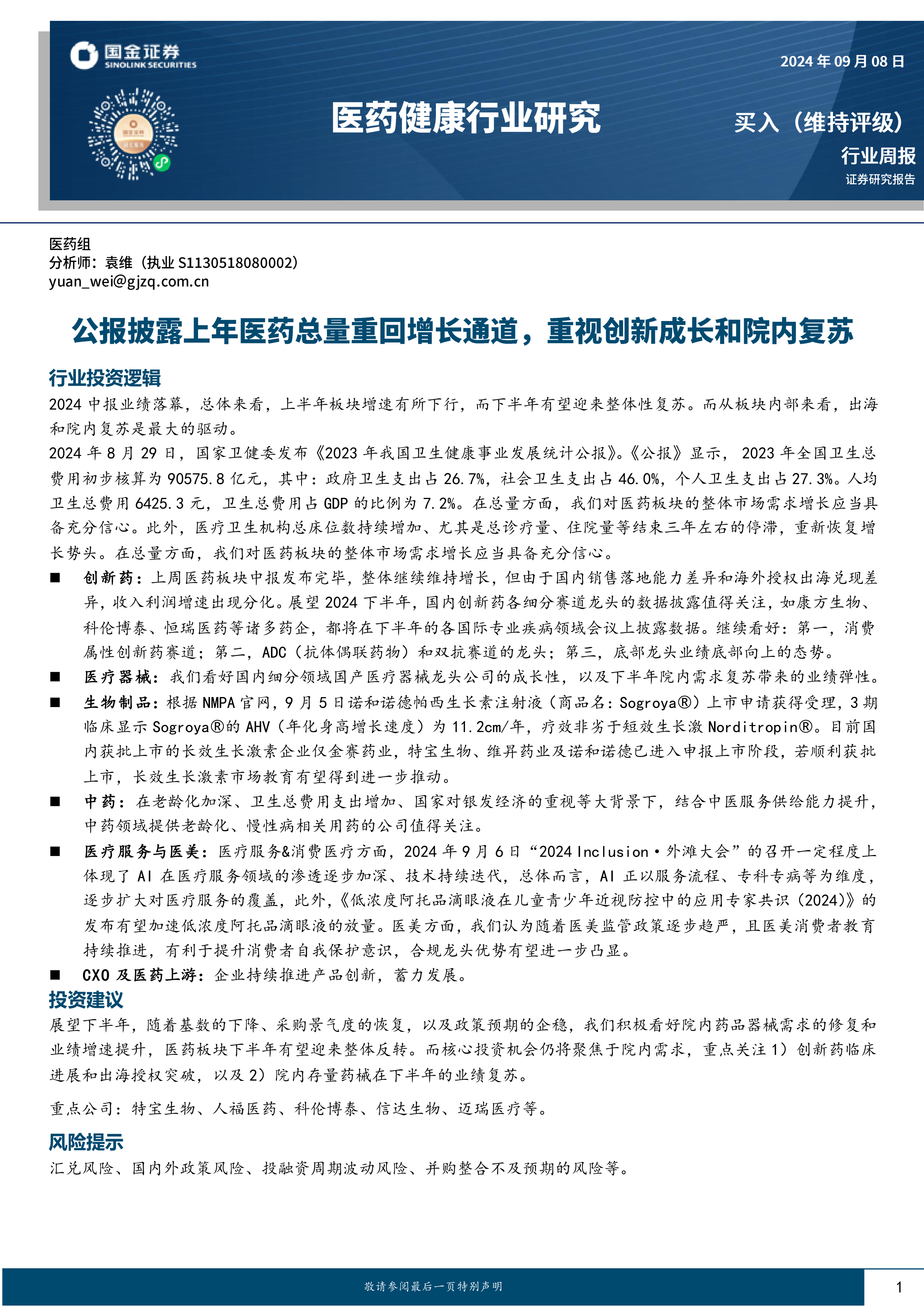 医药健康行业研究:公报披露上年医药总量重回增长通道,重视创新成长和院内复苏
